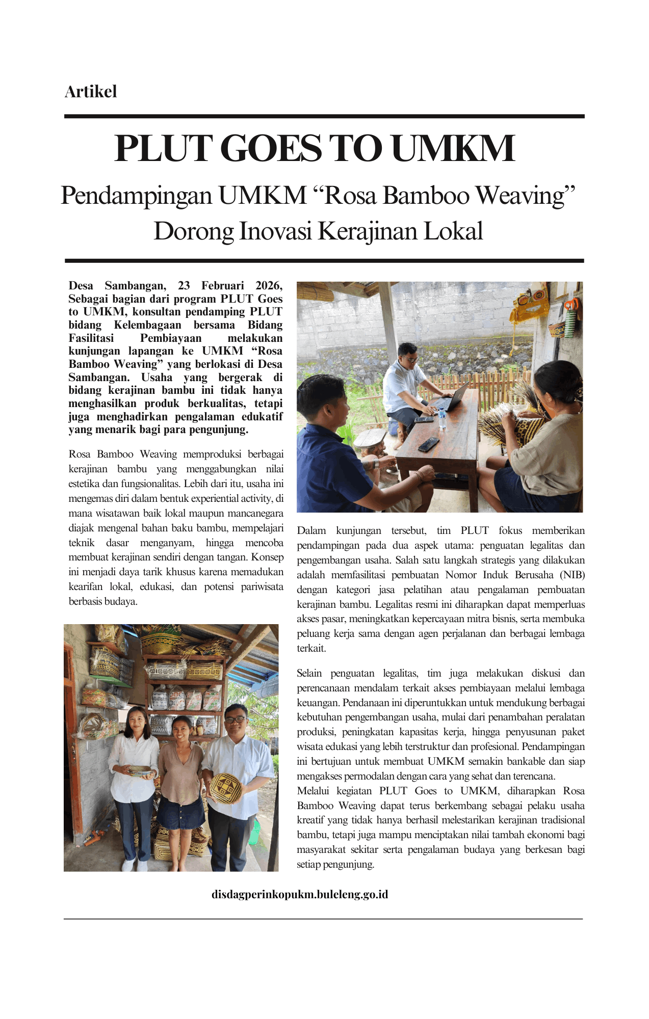Desa Sambangan, 25 Februari 2026 – Sebagai bagian dari program PLUT Goes to UMKM, konsultan pendamping PLUT bidang Kelembagaan bersama Bidang Fasilitasi Pembiayaan melakukan kunjungan lapangan ke UMKM “Rosa Bamboo Weaving” yang berlokasi di Desa Sambangan. Usaha yang bergerak di bidang kerajinan bambu ini tidak hanya menghasilkan produk berkualitas, tetapi juga menghadirkan pengalaman edukatif yang menarik bagi para pengunjung.