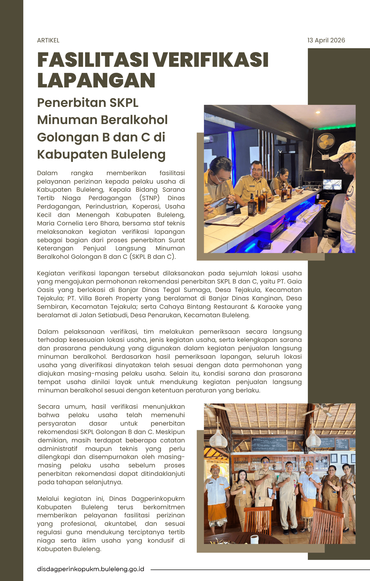 Dalam rangka memberikan fasilitasi pelayanan perizinan kepada pelaku usaha di Kabupaten Buleleng, Kepala Bidang Sarana Tertib Niaga Perdagangan (STNP) Dinas Perdagangan, Perindustrian, Koperasi, Usaha Kecil dan Menengah Kabupaten Buleleng, Maria Cornelia Lero Bhara, bersama staf teknis melaksanakan kegiatan verifikasi lapangan sebagai bagian dari proses penerbitan Surat Keterangan Penjual Langsung Minuman Beralkohol Golongan B dan C (SKPL B dan C).
