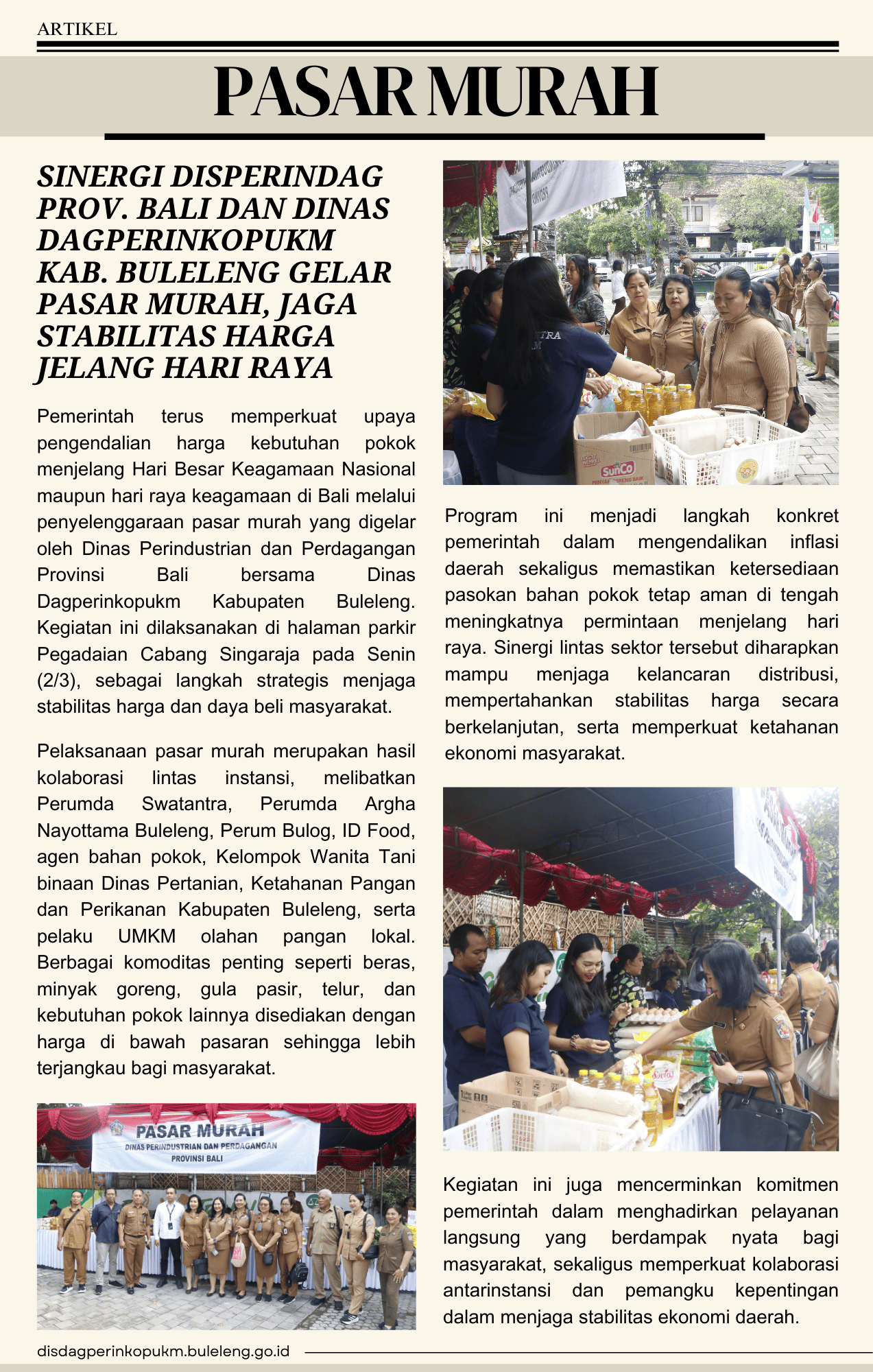 Pemerintah terus memperkuat upaya pengendalian harga kebutuhan pokok menjelang Hari Besar Keagamaan Nasional maupun hari raya keagamaan di Bali melalui penyelenggaraan pasar murah yang digelar oleh Dinas Perindustrian dan Perdagangan Provinsi Bali bersama Dinas Dagperinkopukm Kabupaten Buleleng. Kegiatan ini dilaksanakan di halaman parkir Pegadaian Cabang Singaraja pada Senin (2/3), sebagai langkah strategis menjaga stabilitas harga dan daya beli masyarakat.