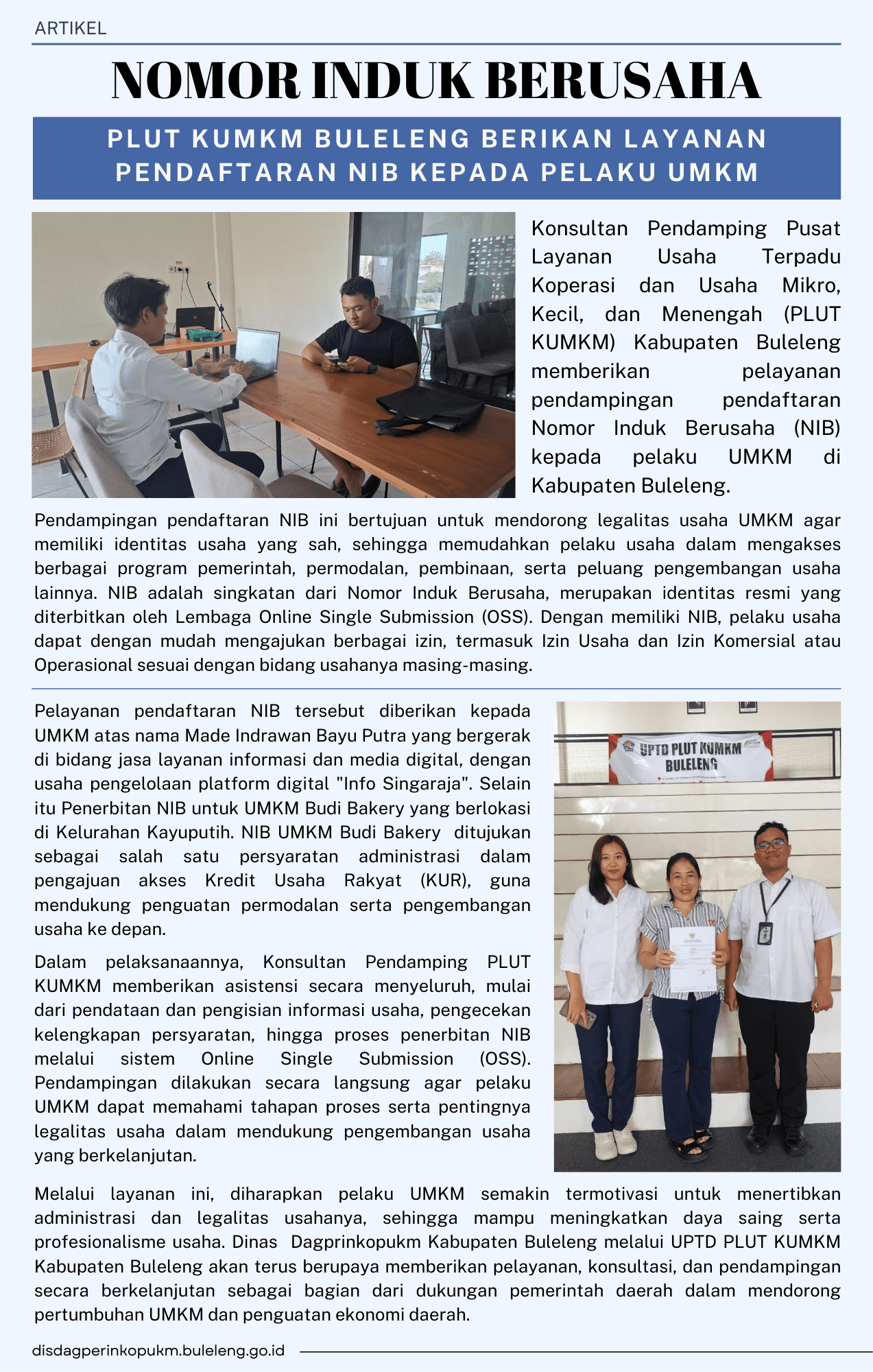 Pelayanan pendaftaran NIB tersebut diberikan kepada UMKM atas nama Made Indrawan Bayu Putra yang bergerak di bidang jasa layanan informasi dan media digital, dengan usaha pengelolaan platform digital "Info Singaraja". Selain itu Penerbitan NIB untuk UMKM Budi Bakery yang berlokasi di Kelurahan Kayuputih. NIB UMKM Budi Bakery ditujukan sebagai salah satu persyaratan administrasi dalam pengajuan akses Kredit Usaha Rakyat (KUR), guna mendukung penguatan permodalan serta pengembangan usaha ke depan.