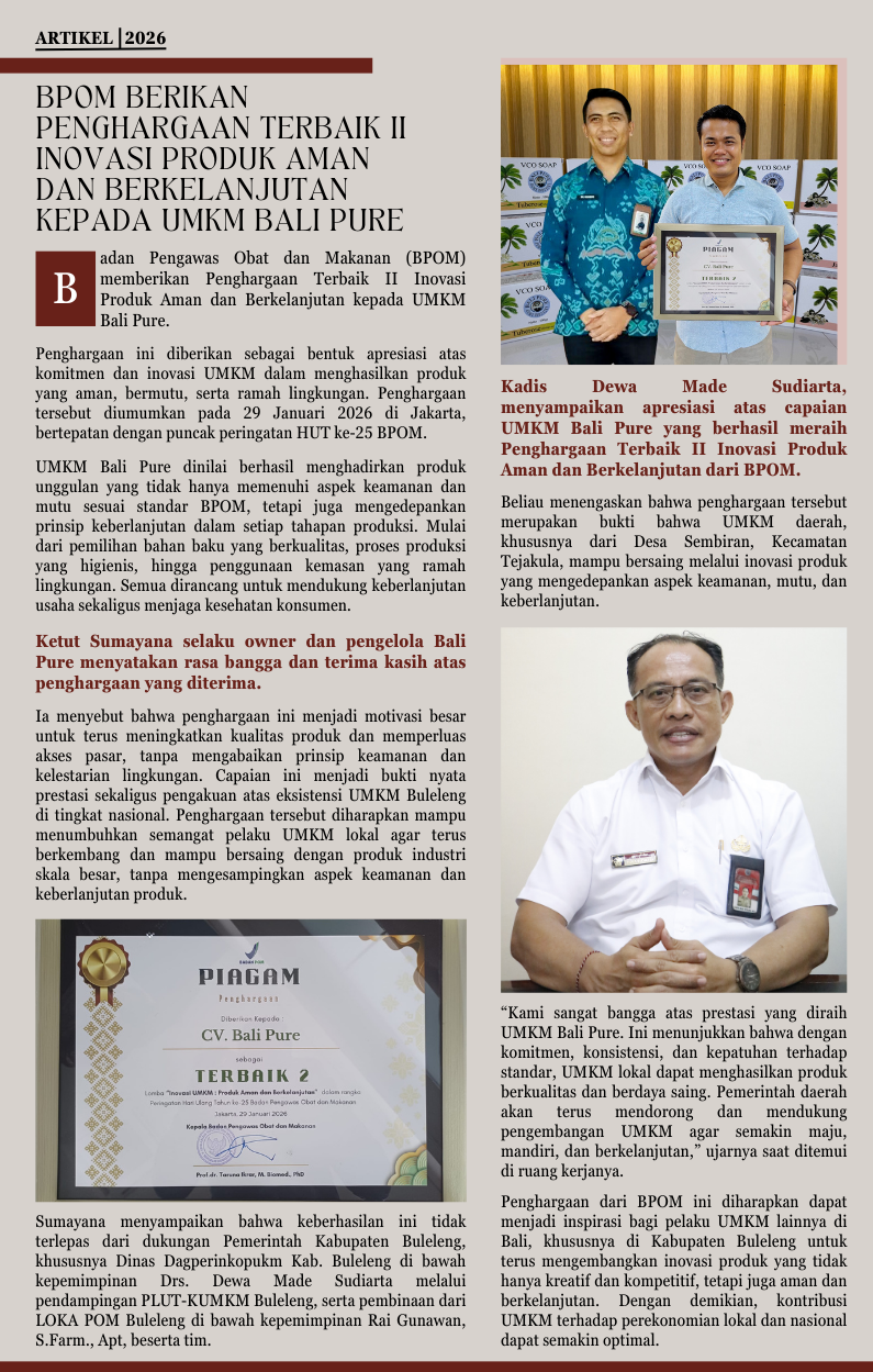 Kadis Dewa Made Sudiarta, menyampaikan apresiasi atas capaian UMKM Bali Pure yang berhasil meraih Penghargaan Terbaik II Inovasi Produk Aman dan Berkelanjutan dari BPOM. Beliau menengaskan bahwa penghargaan tersebut merupakan bukti bahwa UMKM daerah, khususnya dari Desa Sembiran, Kecamatan Tejakula, mampu bersaing melalui inovasi produk yang mengedepankan aspek keamanan, mutu, dan keberlanjutan.