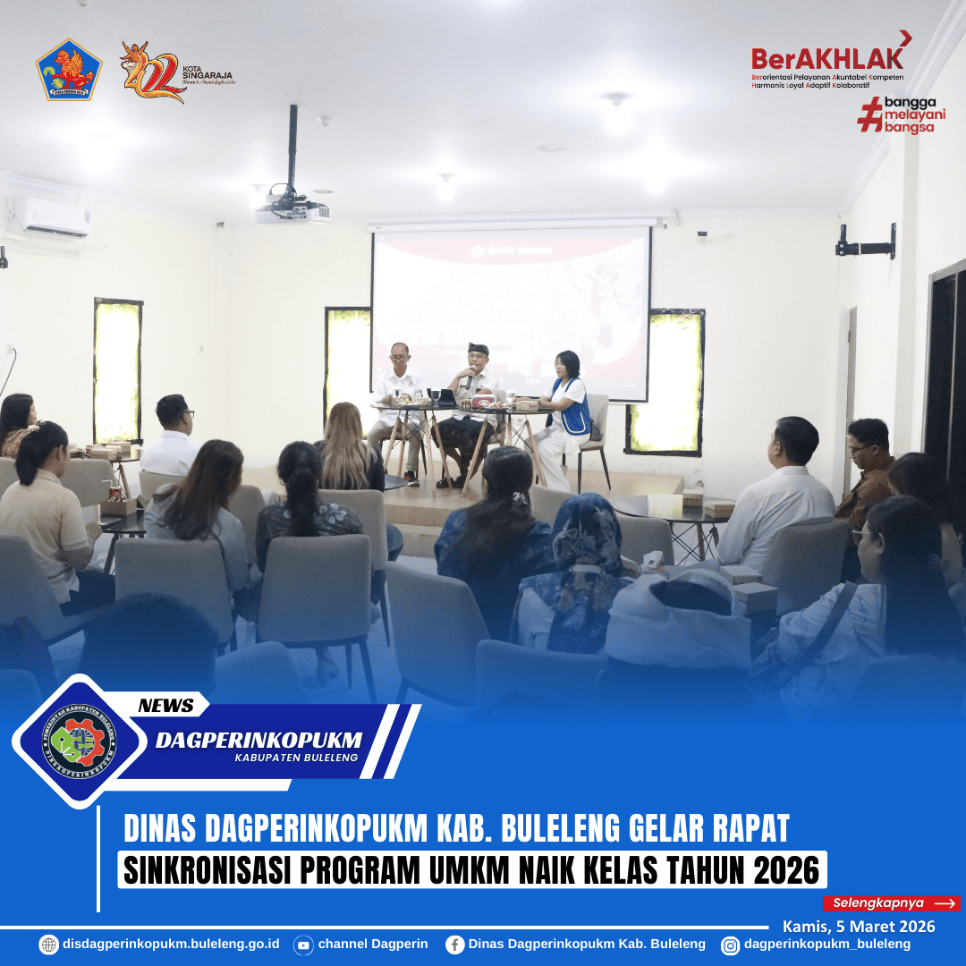 Dinas Dagperinkopukm Kabupaten Buleleng melaksanakan Rapat Sinkronisasi Program UMKM Naik Kelas Tahun 2026 yang bertempat di Gedung PLUT KUMKM Kab. Buleleng, Kamis (5/3). Kegiatan ini diselenggarakan sebagai upaya menyelaraskan program serta memperkuat kolaborasi antar pemangku kepentingan dalam mendukung pengembangan UMKM di Kabupaten Buleleng agar mampu naik kelas dan memiliki daya saing yang lebih baik.