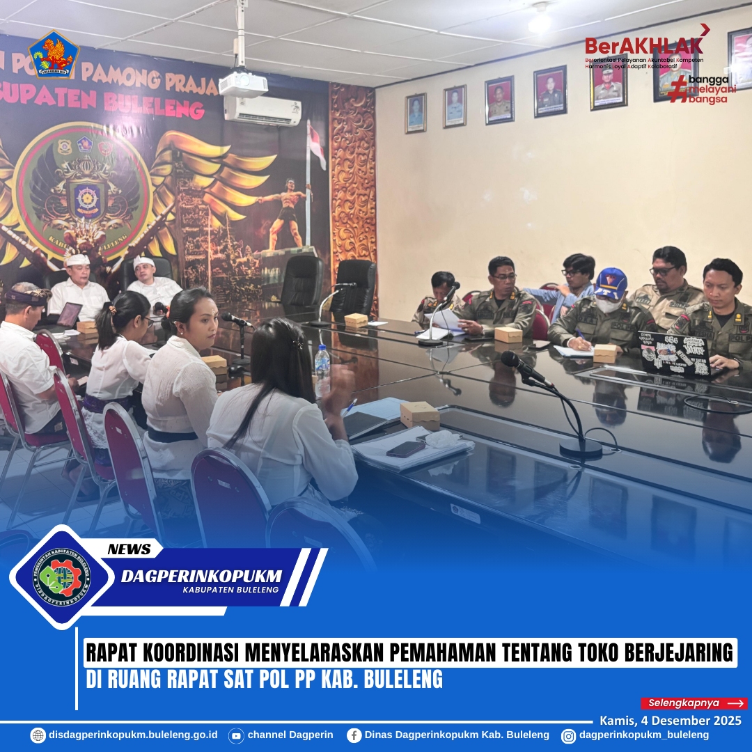 Plt. Kabid Sarana Tertib Niaga Perdagangan Dinas Dagperinkopukm Kab. Buleleng bersama Analis Perdagangan Ahli Pertama menghadiri undangan rapat koordinasi di Ruang Rapat Satpol PP untuk menyelaraskan pemahaman tentang toko modern berjejaring serta tindak lanjut terhadap Instruksi Gubernur No 6 Tahun 2025 tentang Penghentian Sementara Pemberian Izin Toko Modern Berjejaring, Kamis (4/12).