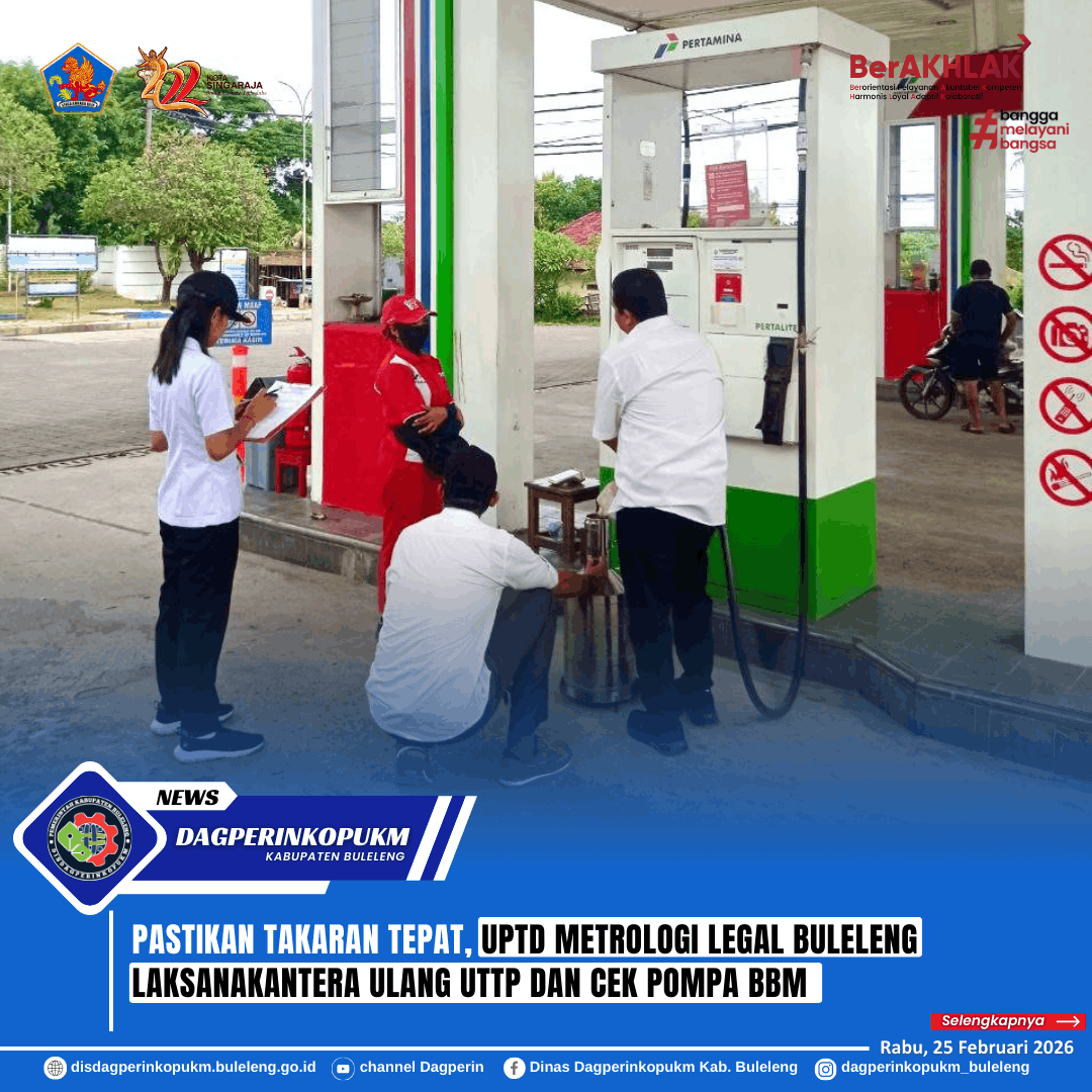 UPTD Metrologi Legal Kabupaten Buleleng melaksanakan kegiatan pelayanan tera ulang alat ukur, takar, timbang, dan perlengkapannya (UTTP) sekaligus pemantauan pompa ukur BBM di sejumlah SPBU pada, Rabu (25/2). Kegiatan ini merupakan bagian dari pengawasan rutin untuk memastikan alat ukur yang digunakan dalam transaksi perdagangan dan penyaluran bahan bakar tetap akurat serta sesuai standar metrologi legal.