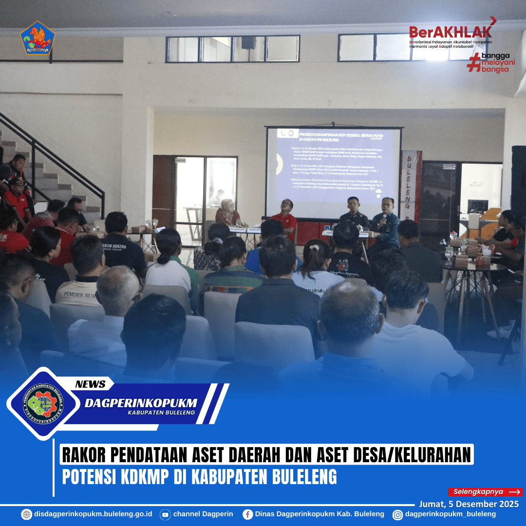 Menindaklanjuti kebijakan pemerintah pusat terkait percepatan pembentukan dan pengembangan Koperasi Desa/Kelurahan Merah Putih (KDKMP), Pemkab Buleleng melalui Dinas Dagperinkopukm Kab. Buleleng melaksanakan Rapat Koordinasi Pendataan Aset Daerah dan Aset Desa/Kelurahan Potensi KDKMP di Kabupaten Buleleng. Rakor dilaksanakan di Gedung Pusat Layanan Usaha Terpadu (PLUT) KUMKM Buleleng, Jumat (5/12).