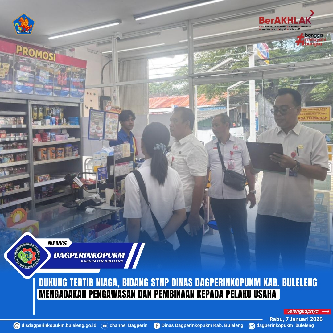 Buleleng, 7 Januari 2026 - Bidang Sarana Tertib Niaga Perdagangan (STNP) Dinas Dagperinkopukm Kabupaten Buleleng melaksanakan kegiatan pengawasan dan pembinaan ke sejumlah pelaku usaha di Kabupaten Buleleng, pada Rabu (7/1). Kegiatan ini bertujuan memastikan bahwa produk yang beredar memenuhi standar keamanan dan memenuhi ketentuan perundang-undangan. Selain itu, tim juga memfasilitasi permohonan rekomendasi gudang dan rekomendasi distributor Gas LPG 3kg sebagai bagian dari upaya menjamin tertib niaga dan perlindungan konsumen.