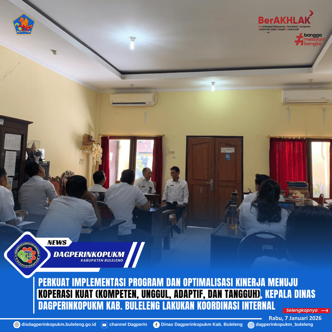Buleleng, 7 Januari 2025 — Kepala Dinas Perdagangan, Perindustrian, Koperasi, Usaha Kecil dan Menengah (DagperinkopUKM) Kabupaten Buleleng melaksanakan kunjungan kerja ke Bidang Koperasi dalam rangka koordinasi internal serta pemberian arahan strategis terkait perencanaan dan pelaksanaan program kerja Bidang Koperasi Tahun 2026. Kegiatan ini bertujuan untuk memastikan arah kebijakan dan perencanaan program Bidang Koperasi selaras dengan prioritas pembangunan daerah, sekaligus memperkuat peran koperasi sebagai pilar penggerak ekonomi kerakyatan di Kabupaten Buleleng.
