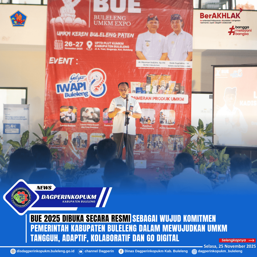 Buleleng UMKM Expo (BUE) kembali hadir sebagai wujud komitmen Pemerintah Kabupaten Buleleng dalam mewujudkan UMKM tangguh, adaptif, kolaboratif dan go digital menuju UMKM Naik Kelas. Buleleng Umkm Expo Tahun 2025 mengambil tema “ UMKM KEREN BULELENG PATEN “. Acara dipusatkan di Gedung Pusat Layanan Usaha Terpadu (PLUT) KUMKM Kabupaten Buleleng dan berlangsung selama 2 hari dimulai dari dimulai dari tanggal 26 s/d 27 November 2025.