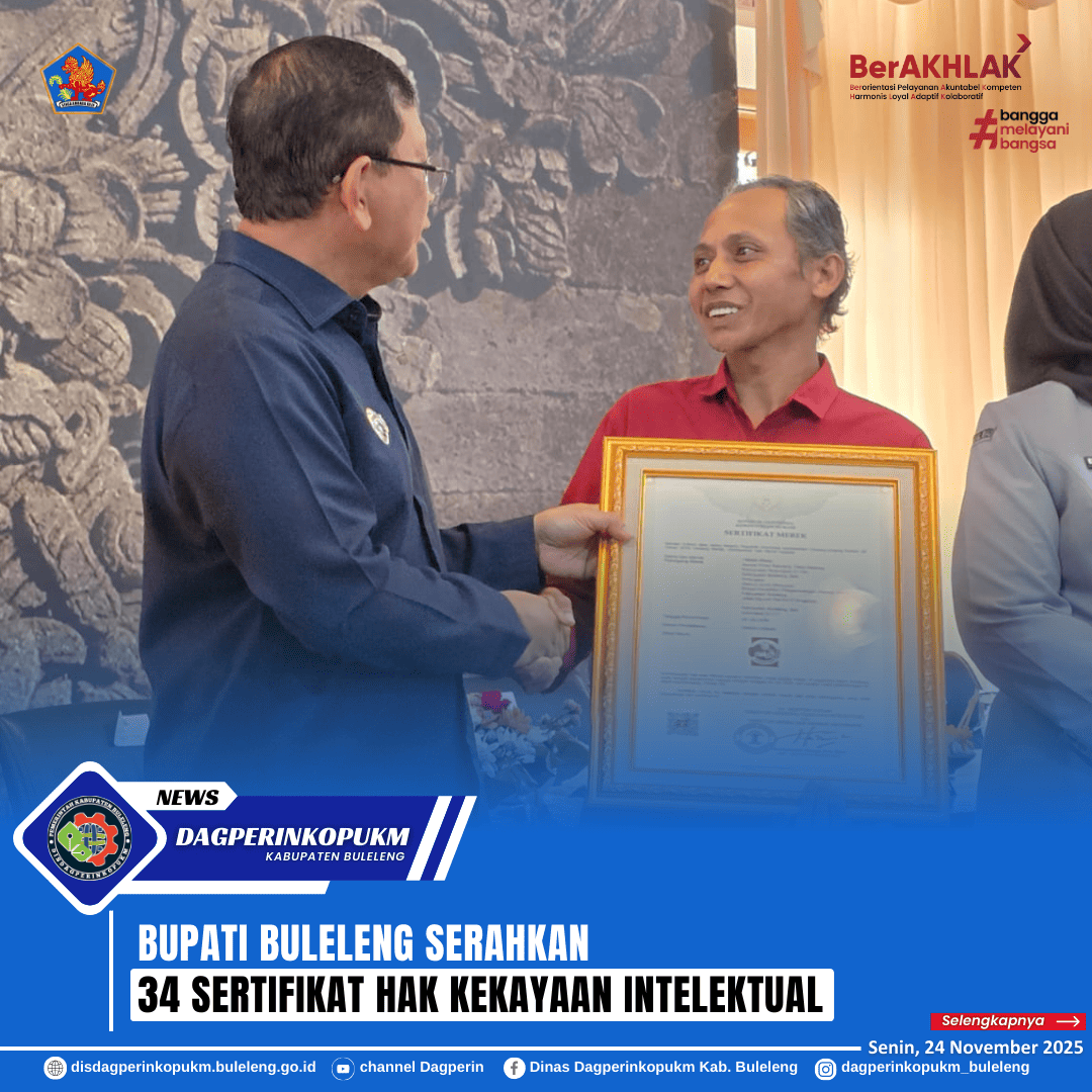 Sertifikat Kekayaan Intelektual diserahkan langsung oleh Bupati Buleleng I Nyoman Sutjidra bersama Wakil Bupati Buleleng Gede Supriatna serta Sekretaris Daerah Kabupaten Buleleng Gede Suyasa. Turut hadir Kakanwil Kemenkum Bali Eem Nurmanah, Asisten Administrasi Umum Setda Kabupaten Buleleng, Kepala Badan Riset dan Inovasi Daerah Kabupaten Buleleng serta undangan lainnya.