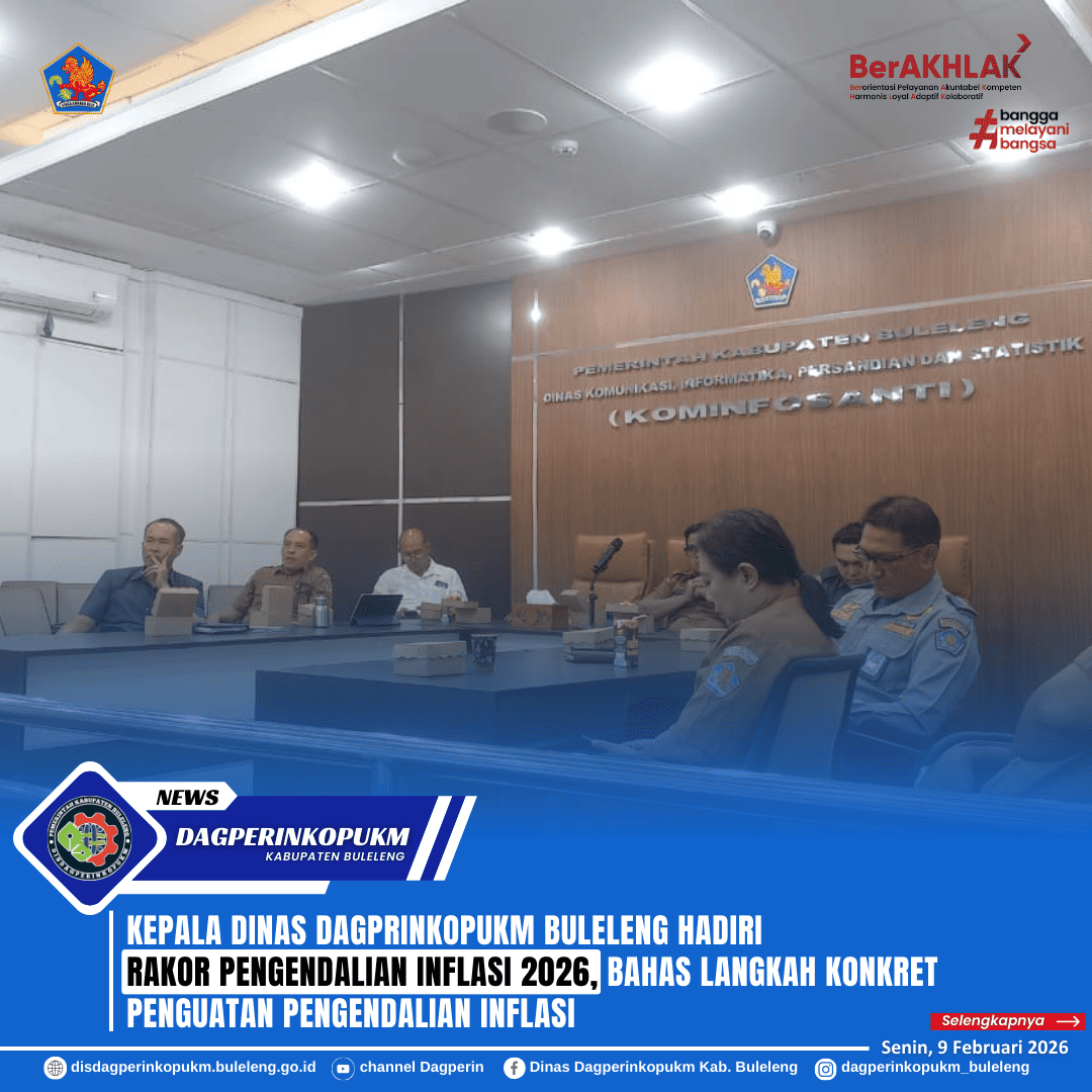 Kepala Dinas Dagprinkopukm Kabupaten Buleleng Dewa Made Sudiarta, didampingi oleh Kepala Bidang Pengembangan Perdagangan Made Mira Tri Yulia Ida Justisiana menghadiri Rapat Koordinasi Pengendalian Inflasi Daerah Tahun 2026 secara daring, bertempat di Gedung Buleleng Command Center (BCC) Dinas Kominfosanti Kabupaten Buleleng, Senin (9/2).