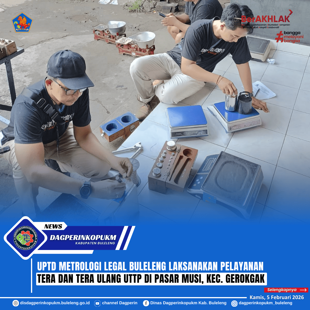Dalam rangka menjamin kebenaran pengukuran serta melindungi hak konsumen dan pelaku usaha, UPTD Metrologi Legal Kabupaten Buleleng melaksanakan pelayanan tera dan tera ulang Alat Ukur, Takar, Timbang dan Perlengkapannya (UTTP) di Pasar Musi, Kecamatan Gerokgak, pada Kamis (5/2).
