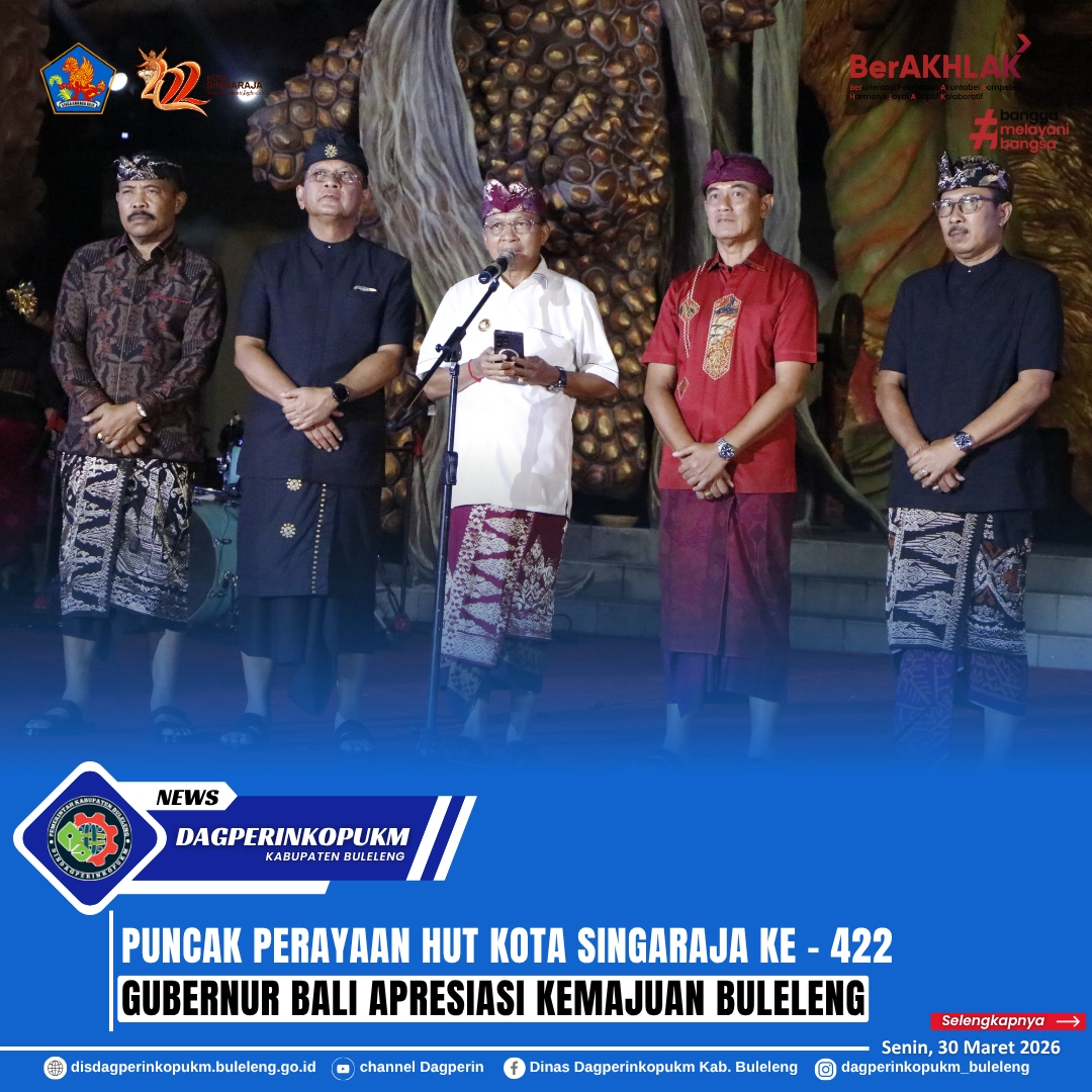 Singaraja, 30 Maret 2026 - Kepala Dinas Dagperinkopukm Kab. Buleleng Dewa Made Sudiarta beserta istri menghadiri Perayaan puncak Hari Ulang Tahun (HUT) ke-422 Kota Singaraja berlangsung meriah di RTH Taman Bung Karno pada Senin (30/3). Dalam kesempatan tersebut, Gubernur Bali I Wayan Koster menyampaikan apresiasi tinggi terhadap kepemimpinan Bupati Buleleng I Nyoman Sutjidra bersama Wakil Bupati Gede Supriatna.