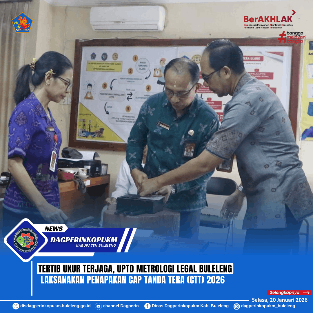 Buleleng, 20 Januari 2026 - UPTD Metrologi Legal Kabupaten Buleleng melaksanakan penapakan Cap Tanda Tera (CTT) Tahun 2026 untuk mengawali kegiatan layanan dan upaya menjamin keabsahan alat ukur, takar, timbang, dan perlengkapannya (UTTP) yang digunakan dalam transaksi perdagangan di wilayah Kabupaten Buleleng.