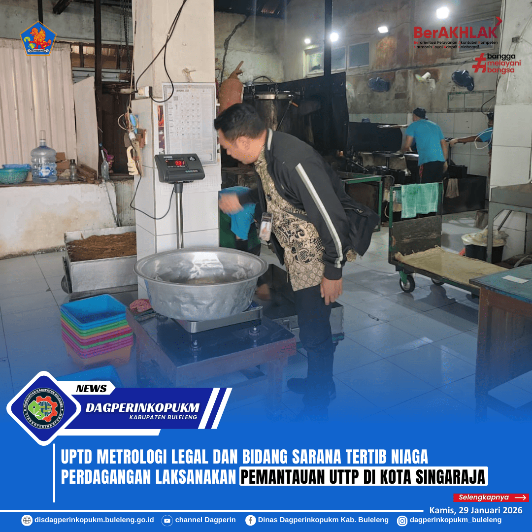 Singaraja, 29 Januari 2026 - UPTD Metrologi Legal bersama Bidang Sarana Tertib Niaga Perdagangan Dinas Dagperikopukm Kabupaten Buleleng melaksanakan kegiatan pemantauan Alat Ukur, Takar, Timbang, dan Perlengkapannya (UTTP) sekaligus pemanggilan wajib tera ulang di sekitar wilayah Kota Singaraja. Kegiatan ini dilakukan sebagai upaya mewujudkan tertib ukur serta melindungi hak konsumen dan pelaku usaha.
