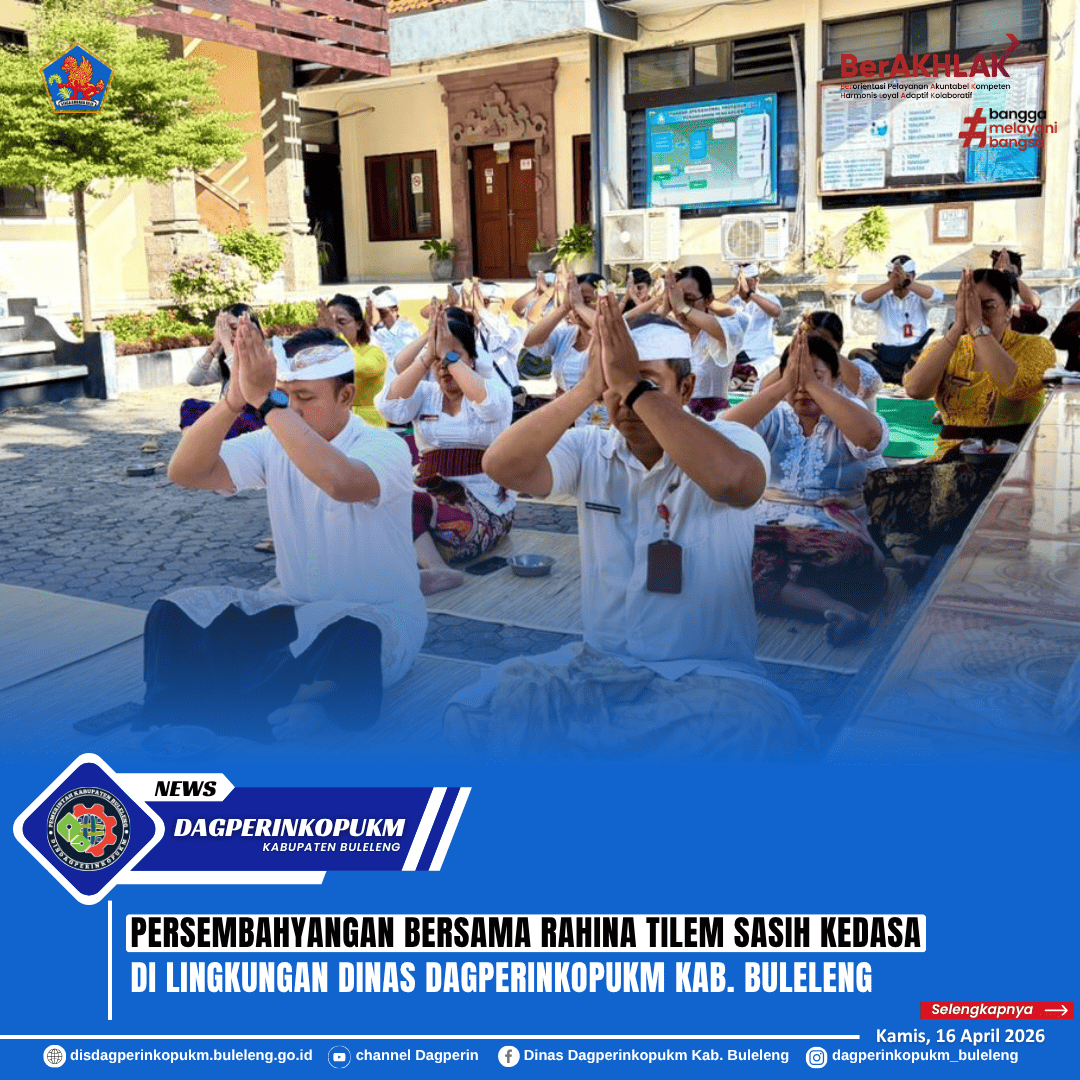 Ring Rahina Tileh Sasih Kedasa, seluruh pegawai lingkup Dinas Dagperinkopukm Kabupaten Buleleng melaksanakan persembahyangan bersama di Padmasana Dinas Dagperinkopukm Kab. Buleleng, Kamis (16/4).