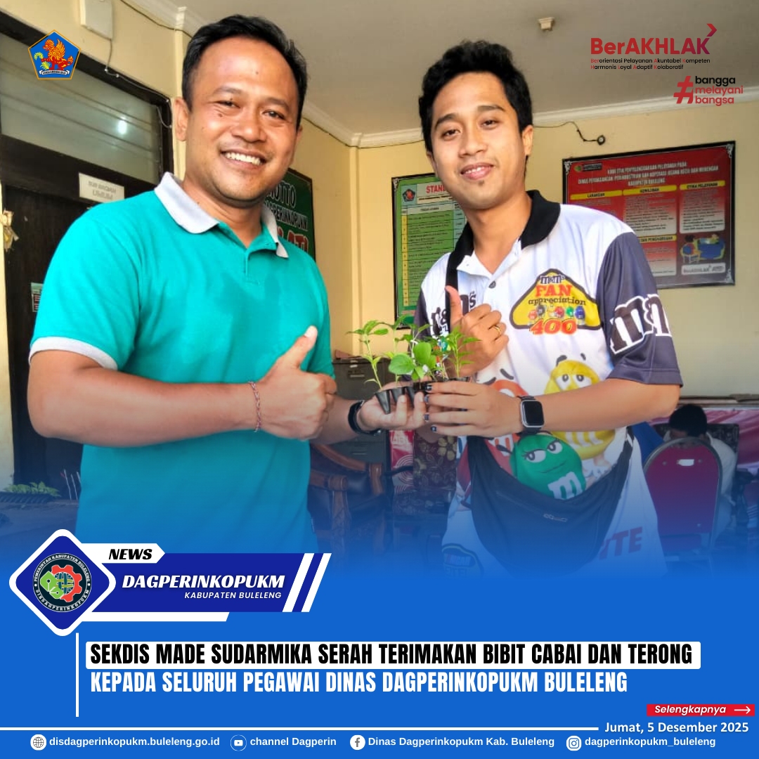 Menindaklanjuti arahan Wakil Bupati Buleleng, Sekretaris Dinas Perdagangan, Perindustrian dan Koperasi, Usaha Kecil dan Menengah KabuPaten Buleleng, Bapak I Made Sudarmika, S.T., M.T. menyerahkan langsung kepada seluruh Pegawai untuk selanjutnya ditanam dan dipelihara oleh masing - masing pegawai dan ditanam di lingkungan Dagperinkopukm Buleleng.