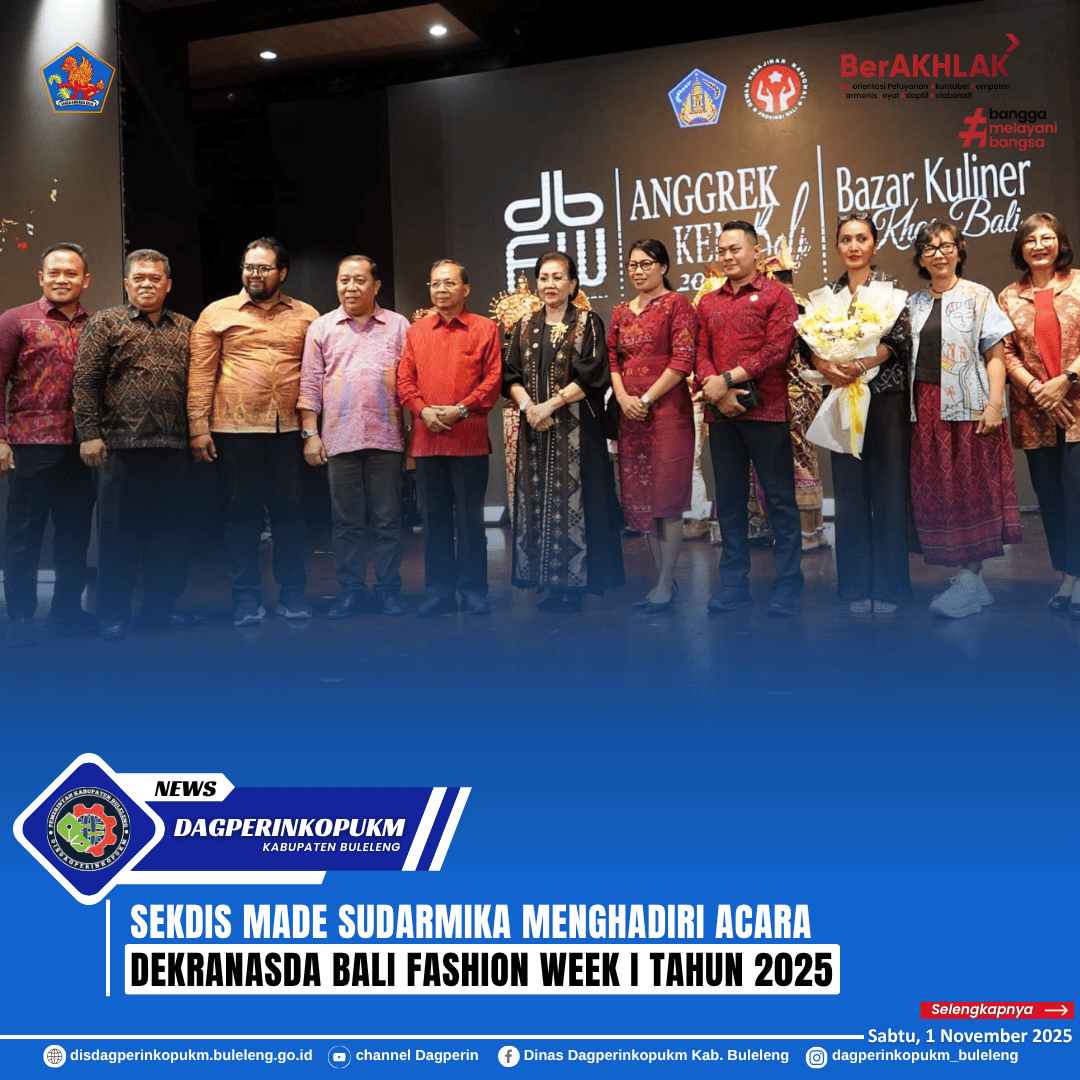 Wakil Ketua I Dewan Kerajinan Nasional Daerah (Dekranasda) Kabupaten Buleleng Ny. Hermawati Supriatna didampingi Sekretaris Dinas Dagperinkopukm Kabupaten Buleleng I Made Sudarmika menghadiri undangan Dekranasda Bali Fashion Week I yang digelar di Gedung Ksirarnawa Taman Budaya Provinsi Bali, pada Sabtu (1/11).