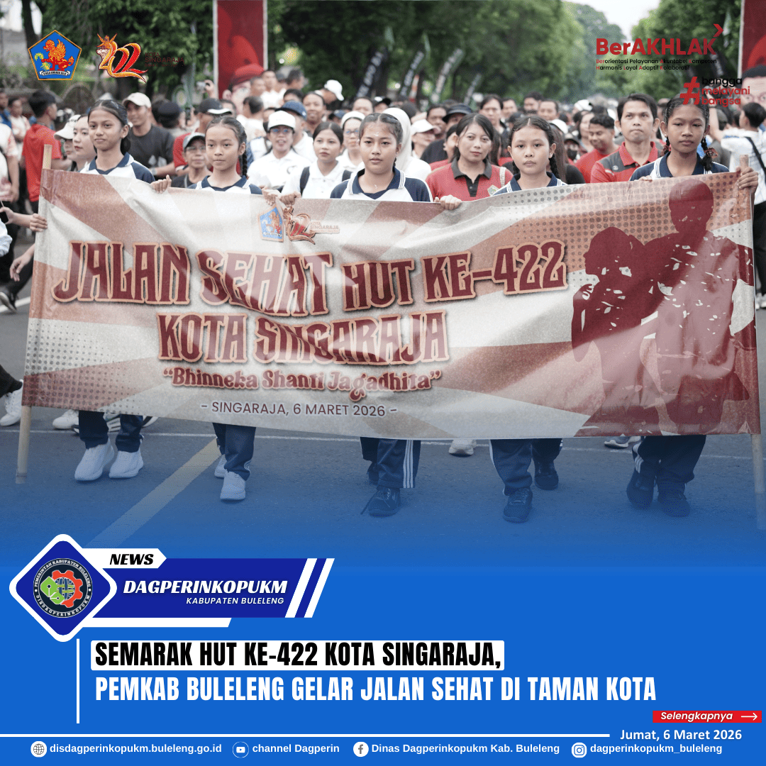 Pemerintah Kabupaten Buleleng melaksanakan kegiatan Jalan Sehat sebagai bagian dari rangkaian peringatan Hari Ulang Tahun ke-422 Kota Singaraja Tahun 2026 yang dipusatkan di Taman Kota Singaraja, Jumat (6/3). Bupati Buleleng, I Nyoman Sutjidra bersama Wakil Bupati Buleleng, Gede Supriatna bersama Ketua DPRD beserta Forkopimda Buleleng melepas kegiatan jalan sehat tersebut.