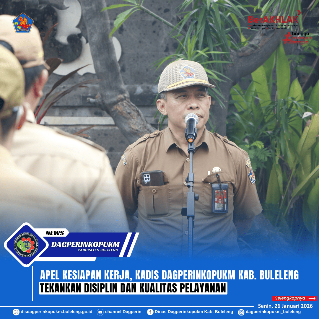 Dinas Dagperinkopukm Kabupaten Buleleng melaksanakan Apel Kesiapan Kerja di halaman kantor dinas, Senin pagi (26/1). Kegiatan ini dipimpin langsung oleh Kepala Dinas Dagperinkopukm Kabupaten Buleleng Dewa Made Sudiarta dan diikuti oleh seluruh pejabat struktural, fungsional serta staf.