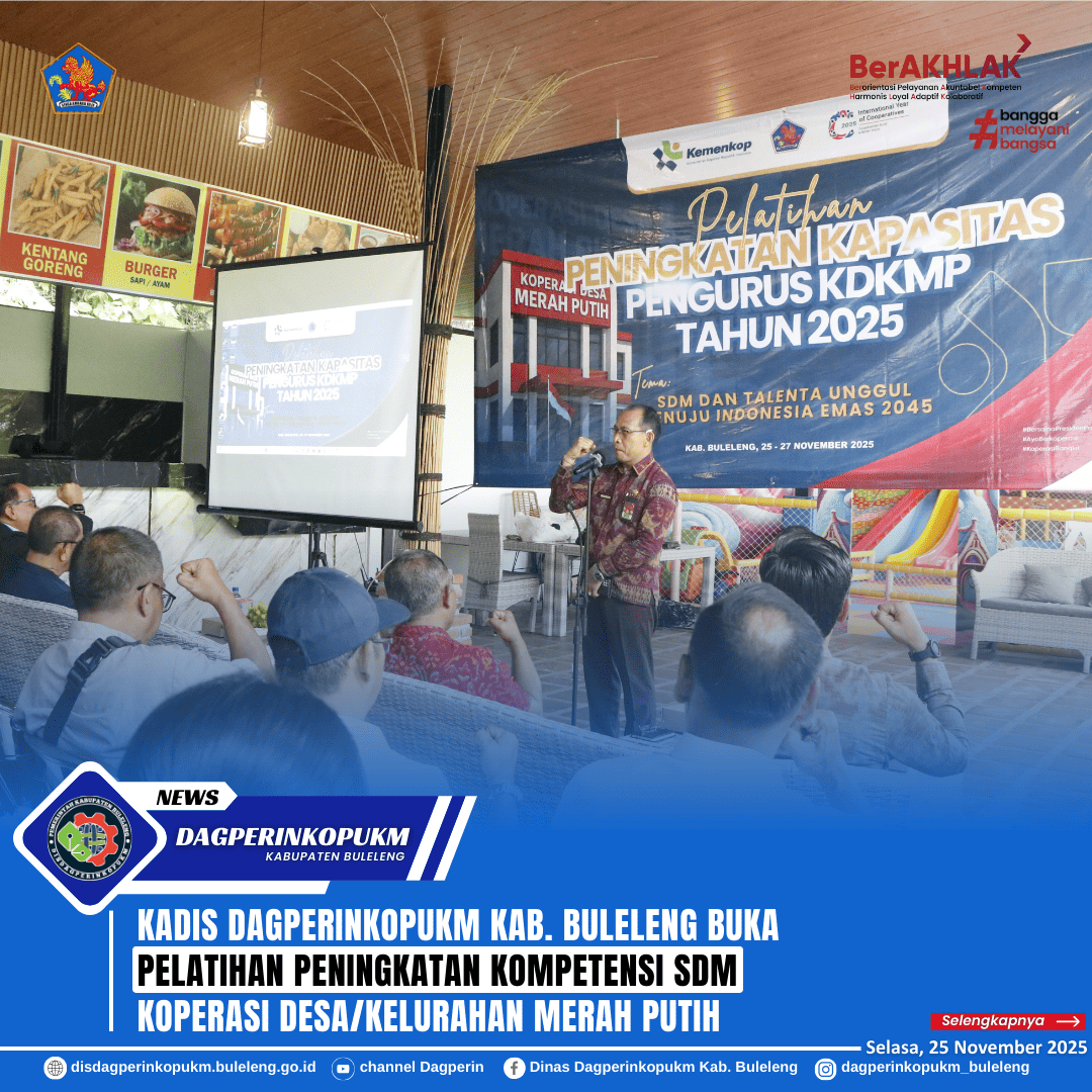 Menindaklanjuti hasil Rapat Persiapan Peningkatan Kompetensi SDM Koperasi Desa/Kelurahan Merah Putih di Hotel Aston Denpasar pada tanggal 29 s.d 30 Oktober 2025, Dinas Koperasi dan UKM Provinsi Bali melalui Dinas Dagperinkopukm Kabupaten Buleleng melaksanakan kegiatan Pelatihan Peningkatan Kompetensi SDM Koperasi Desa/Kelurahan Merah Putih Tahun 2025.