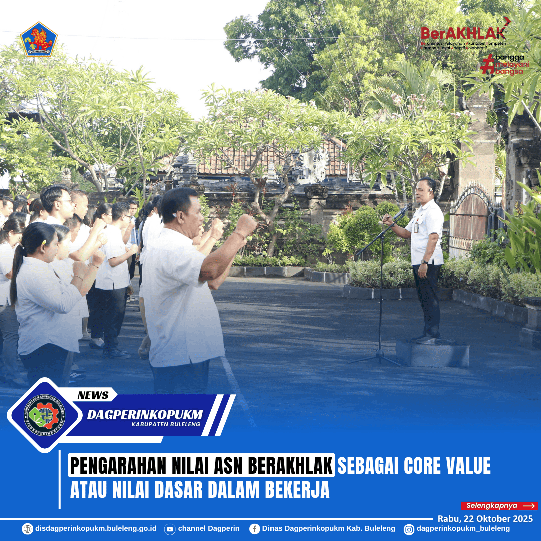 Pengarahan nilai-nilai dasar BerAKHLAK bertujuan untuk memperkuat budaya kerja dan menyatukan nilai-nilai inti Aparatur Sipil Negara (ASN) pada Dinas Dagperinkopukm Kabupaten Buleleng. Nilai-nilai ini menjadi panduan bagi ASN dalam memberikan pelayanan prima kepada masyarakat, mengelola sumber daya secara efisien, serta membangun lingkungan kerja yang positif dan profesional.
