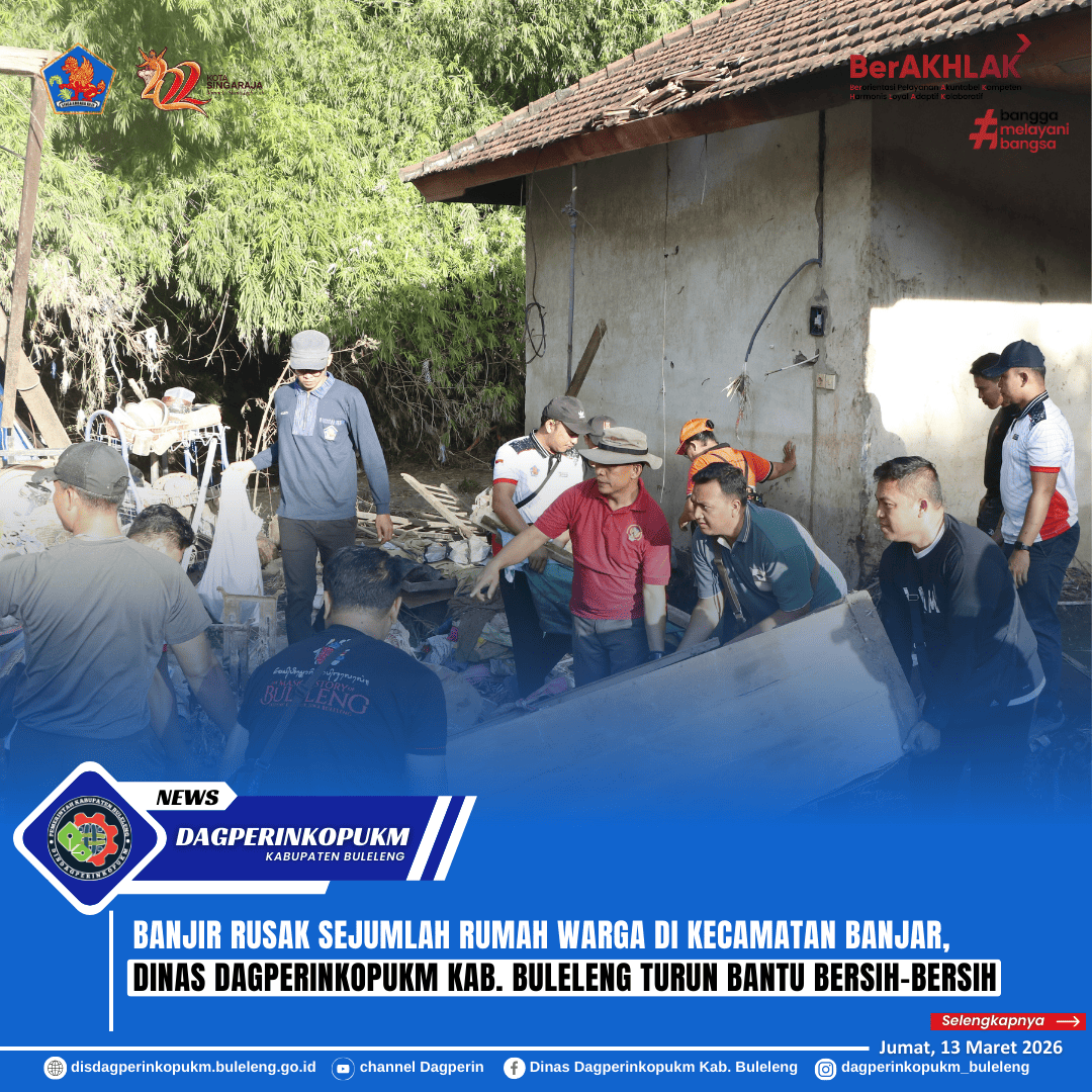 Kepala Dinas Dagprinkopukm Kabupaten Buleleng Drs. Dewa Made Sudiarta, M.Si. bersama Sekretaris dinas dan staf ikut serta pada kegiatan tersebut. Kegiatan ini dilakukan bersama perangkat desa, instansi terkait, serta masyarakat setempat untuk membersihkan sisa lumpur, sampah, dan material yang terbawa banjir.