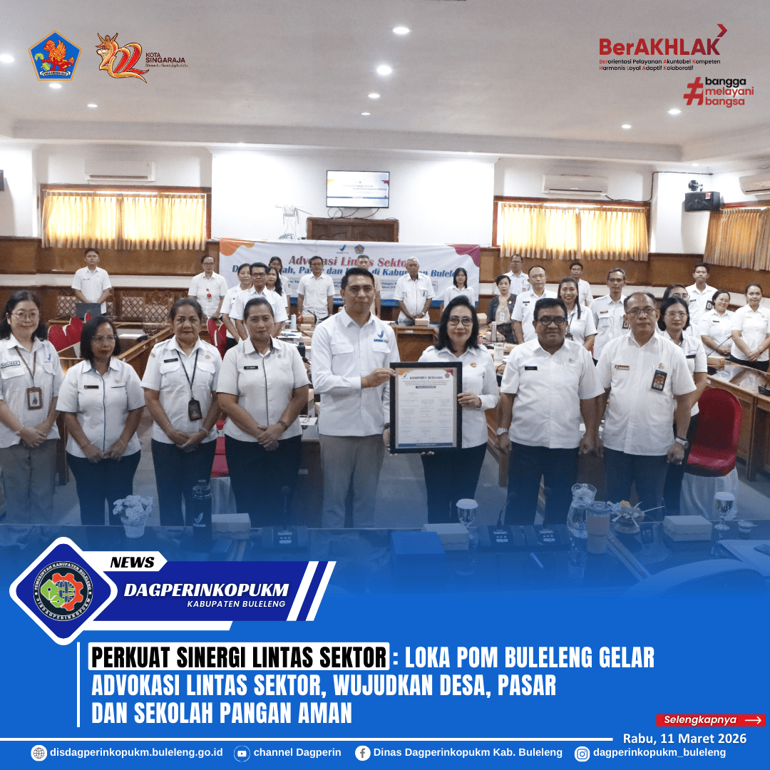 LOKA POM di Kabupaten Buleleng menggelar kegiatan Advokasi Lintas Sektor terkait program Desa Pangan Aman, Pasar Pangan Aman Berbasis Komunitas (PPABK), serta Sekolah yang Melaksanakan Pembudayaan Keamanan Pangan (SAPA Sekolah) sebagai strategi percepatan penurunan dan pencegahan stunting periode 2025–2029. Kegiatan ini dilaksanakan di Ruang Rapat Unit IV Setda Kabupaten Buleleng, Rabu (11/3).