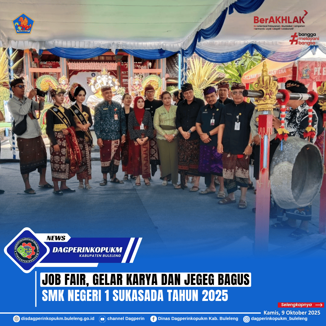 Dinas DagperinkopUKM Kabupaten Buleleng pada kesempatan ini diwakilkan oleh Ka. TU UPTD PLUT KUMKM Buleleng I Komang Budiwartama bersama Pendamping KUMKM Bidang Pemasaran Gede Handika menghadiri acara Job Fair, Gelar Karya dan Jegeg Bagus SMK Negeri 1 Sukasada dengan mengusung tema “Entrepreneurial Excellence (Building Careers at SMK Negeri 1 Sukasada)" pada, Kamis (9/10).