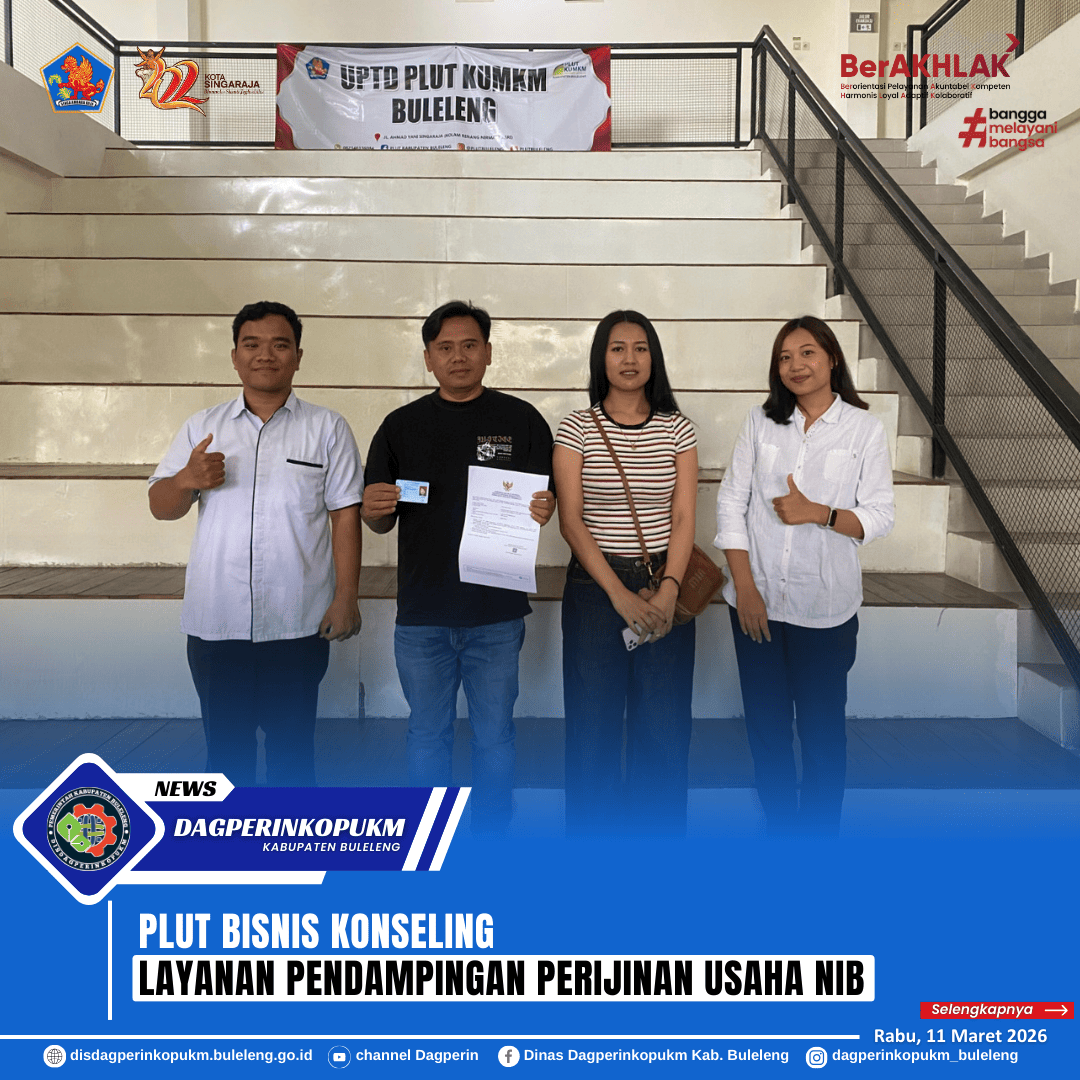 Singaraja, 11 Maret 2026 - Konsultan Pendamping PLUT KUMKM Kabupaten Buleleng Bidang Kelembagaan memberikan layanan pendampingan perijinan usaha kepada tiga pelaku UMKM sebagai bagian dari upaya meningkatkan legalitas usaha serta memperluas akses pengembangan usaha bagi pelaku UMKM di Kabupaten Buleleng. Pendampingan ini bertujuan membantu pelaku usaha memahami proses pendaftaran perijinan usaha secara mudah melalui sistem perizinan berusaha berbasis risiko.