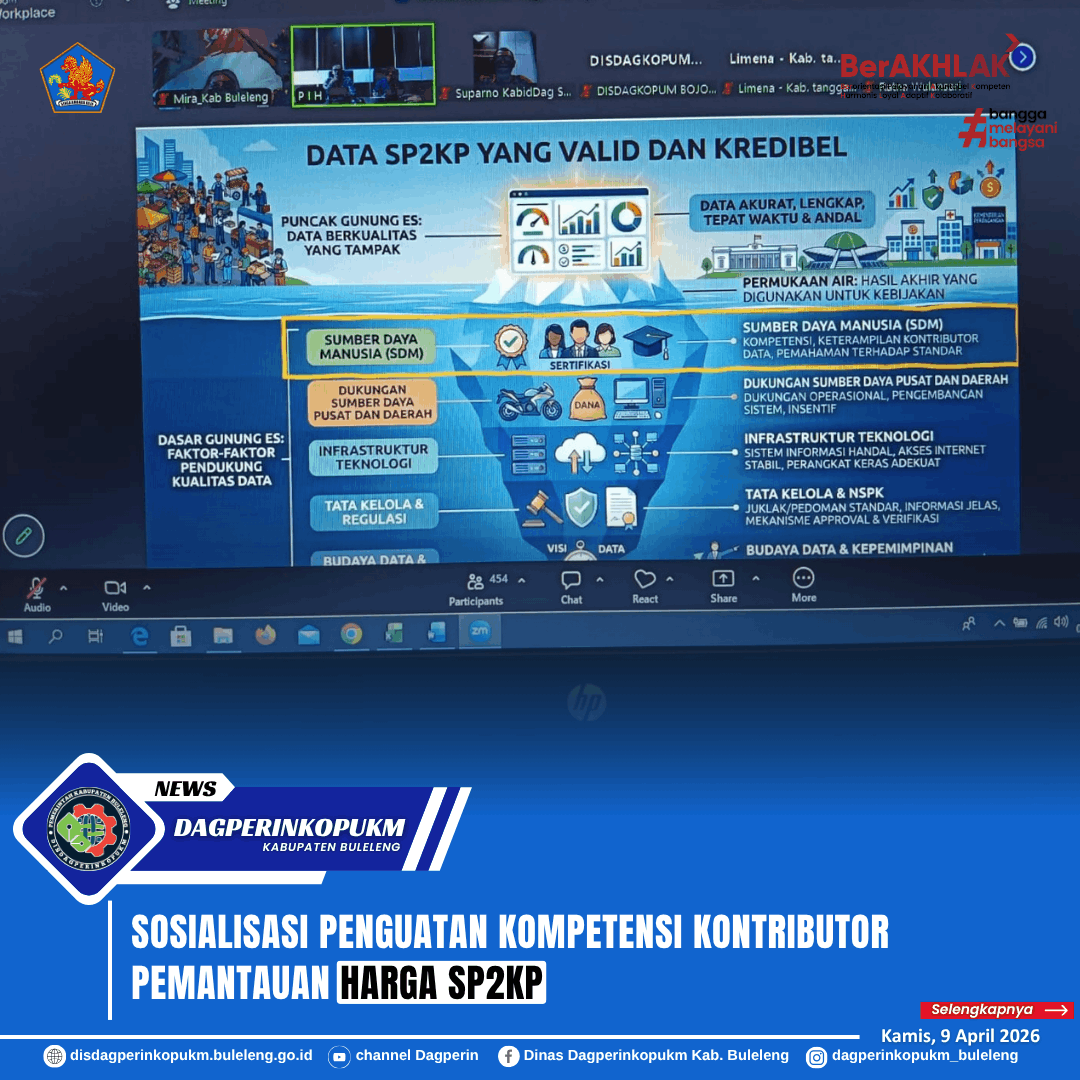Pada hari Kamis, 9 April 2026, Kepala Bidang Pengembangan Perdagangan Mira Tri Yulia Ida Justisiana, ST.M.A.P, Pengawas Perdagangan, beserta kontributor SP2KP menghadiri kegiatan Sosialisasi Penguatan Kompetensi Kontributor Pemantau Harga SP2KP melalui Self Learning Pemantauan dan Pelaporan Barang Kebutuhan Pokok dan Barang Penting (Bapok) yang dilaksanakan secara daring melalui Zoom Meeting.