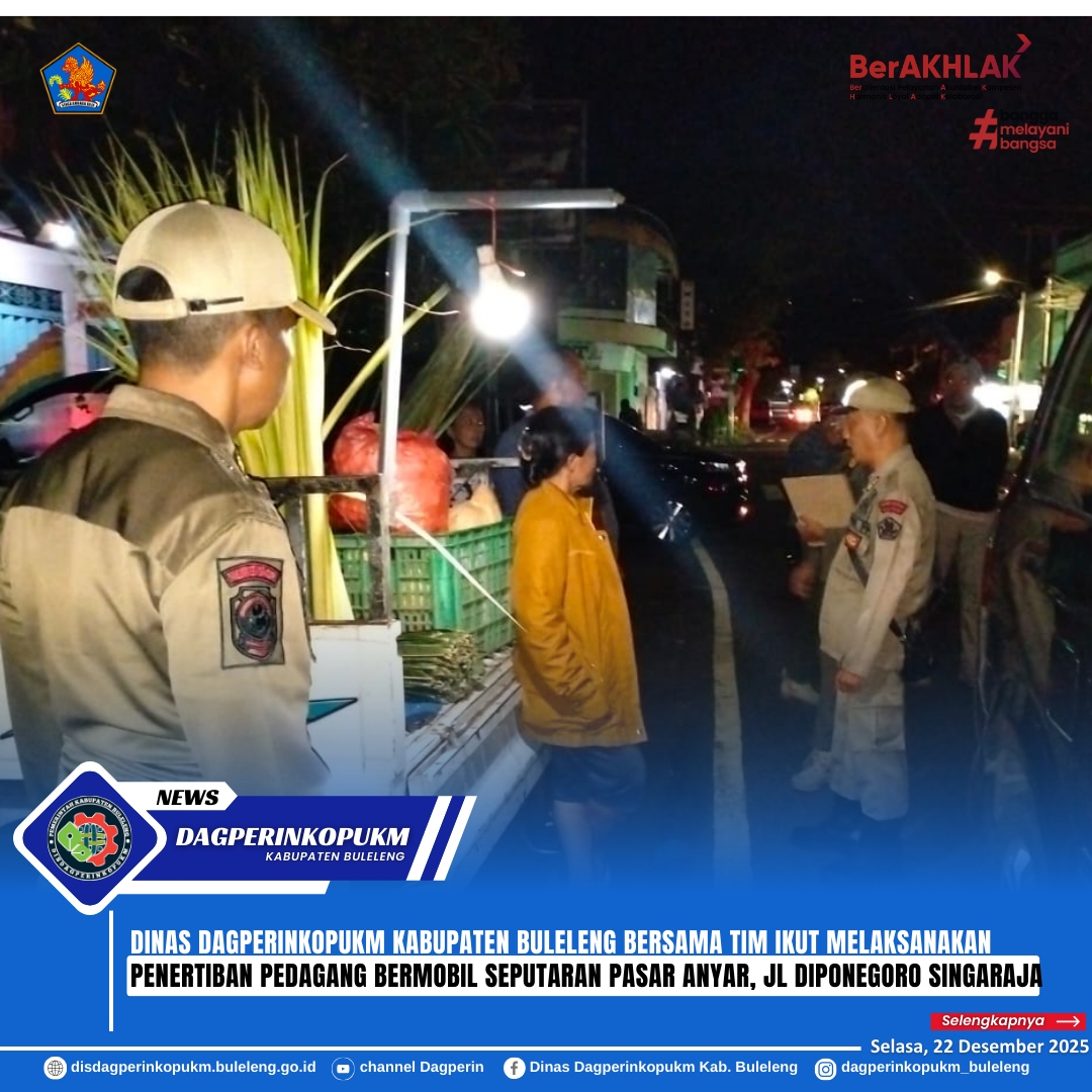 Kegiatan Penertiban Pedagang Bermobil Seputaran Pasar Anyar Jl Diponegoro Singaraja. Kegiatan ini dilaksananan untuk Mendukung Surat Edaran (SE) Nomor 400.6.1/9548/S Tentang Kesiapsiagaan Pada Saat Natal Tahun 2025 dan Tahun Baru 2026 Pada Point 7 Tentang Menjaga Ketentraman Dan Ketertiban Umum yang dilaksanakan pada (23/12)