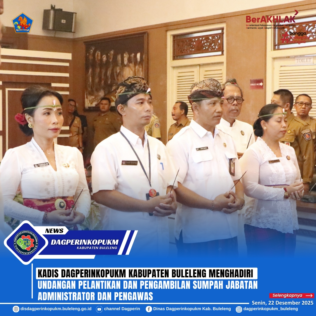 Pemerintah Kabupaten Buleleng melaksanakan pelantikan dan pengambilan sumpah/janji pejabat administrasi dan pengawas di lingkungan Dinas Kependudukan dan Pencatatan Sipil (Disdukcapil), Senin (22/12), di Kantor Bupati Buleleng, yang dipimpin langsung oleh Bupati Buleleng Nyoman Sutjidra. Pejabat yang dilantik meliputi Sekretaris Dinas, dua Kepala Bidang, dan Kepala Sub Bagian Umum.