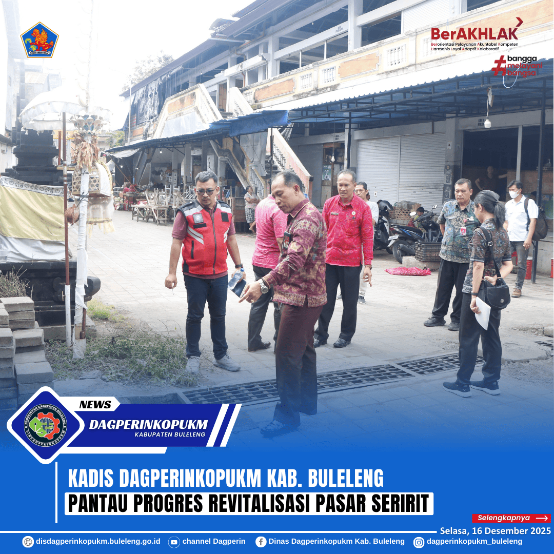 Kepala Dinas Dagperinkopukm Kabupaten Buleleng Dewa Made Sudiarta didampingi Plt. Kepala Bidang STNP serta staf teknis melakukan pemantauan langsung terhadap progres revitalisasi fisik Pasar Seririt, Selasa (16/12). Kegiatan ini dilakukan untuk memastikan pelaksanaan perbaikan berjalan sesuai dengan rencana.