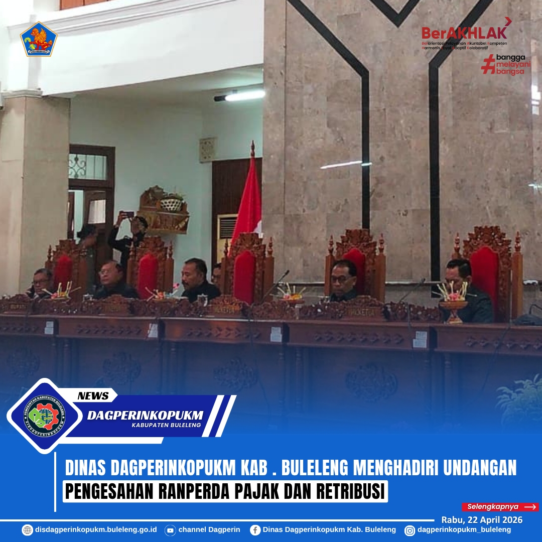 SIngaraja, 22 April 2026 - Sekretaris Dinas Dagperinkopukm Kab. Buleleng I Made Sudarmika mewakili kepala dinas Dagperinkopukm Kab. Buleleng guna menghadiri undangan Sidang Paripurna yang diselenggarakan di Gedung DPRD Kab. Buleleng pada, Rabu (22/4).