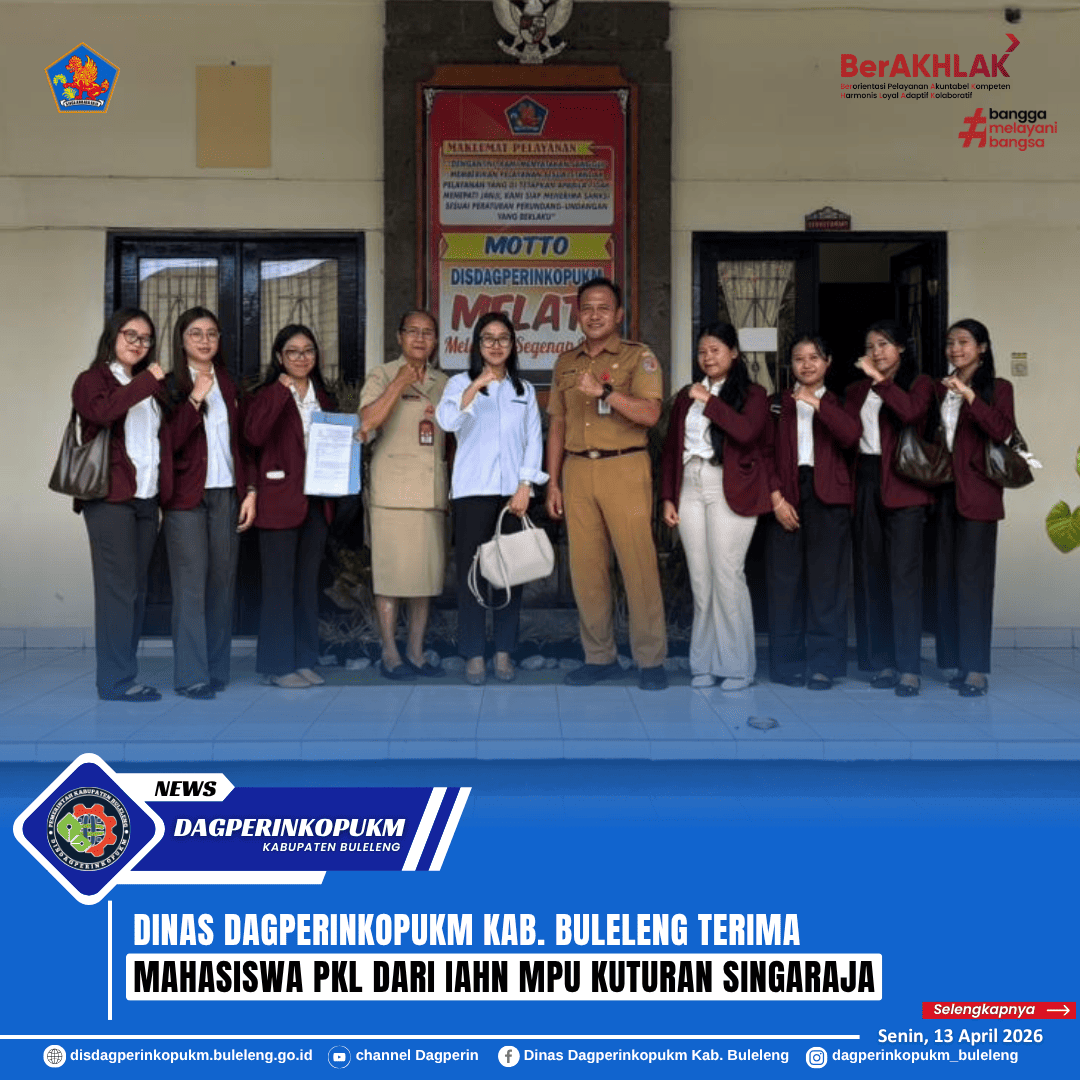 Sekretaris Dinas Perdagangan, Perindustrian, Koperasi, Usaha Kecil dan Menengah Kabupaten Buleleng, I Made Sudarmika, didampingi Kepala Sub Bagian Umum dan Kepegawaian, menerima kedatangan mahasiswa dari Institut Agama Hindu Negeri Mpu Kuturan (IMK) Singaraja yang akan melaksanakan Program Praktik Kerja Lapangan (PKL) di lingkungan Dinas Dagperinkopukm Kabupaten Buleleng, pada Senin (13/4).