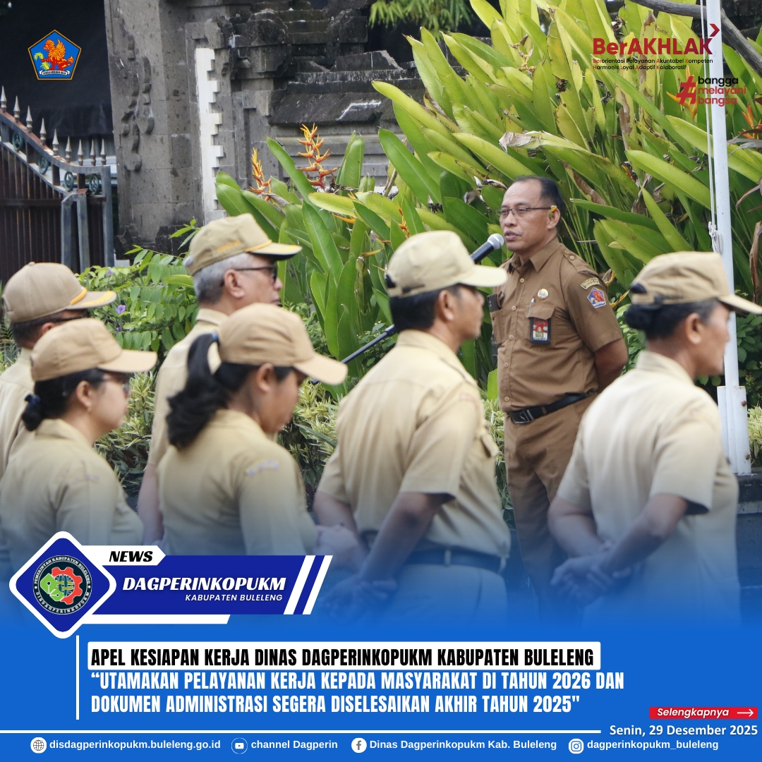 Apel dipimpin langsung oleh Kepala Dinas DagperinkopUKM Kabupaten Buleleng Drs. Dewa Made Sudiarta, M.Si serta diikuti oleh seluruh jajaran dan Staf. Pada arahannya, Kadis Dewa Sudiarta menyampaikan kepada seluruh pegawai untuk mengutamakan pelayanan serta pendampingan di tahun 2026 mendatang kepada masyarakat terutama pelaku UMKM di lingkup pemerintah Kabupaten Buleleng. Tidak lupa juga disampaiakan kepada seluruh staf dan pegawai di Dagperinkopukm untuk segera menyelesaikan administrasi kepegawaiannya bagi yang belum karena ini sudah memasuki akhir bulan dan juga akhir tahun.