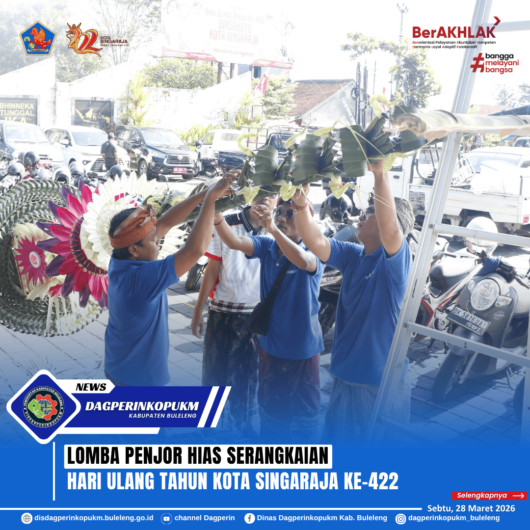 Dinas DagperinkopUKM Kabupaten Buleleng turut berpartisipasi dalam Lomba Penjor Hias serangkaian Hari Ulang Tahun Kota Singaraja ke-422. Kegiatan ini dilaksanakan di RTH Bung Karno sebagai wujud pelestarian budaya serta semangat kreativitas dalam memeriahkan hari jadi Kota Singaraja.