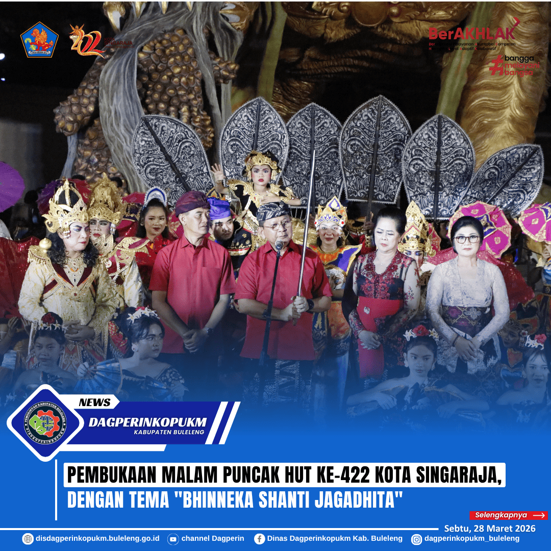 Kepala Dinas Dagperinkopukm Kabupaten Buleleng Drs. Dewa Made Sudiarta, M.Si menghadiri acara Pembukaan Malam Puncak Perayaan Hari Ulang Tahun (HUT) ke-422 Kota Singaraja yang berlangsung meriah di Ruang Terbuka Hijau (RTH) Taman Bung Karno, Sabtu (28/3).