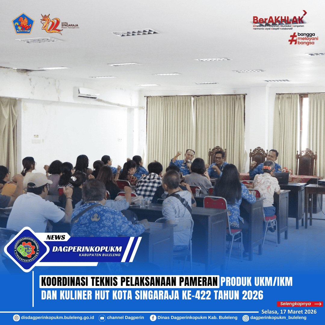 Selasa, 17 Maret 2026 - Dalam rangka memantapkan persiapan pelaksanaan Pameran Produk UKM/IKM dan Kuliner untuk memperingati HUT Kota Singaraja ke-422 Tahun 2026, Dinas Dagperinkopukm Kabupaten Buleleng menggelar rapat koordinasi. Rakor ini dihadiri oleh peserta pameran Produk UKM/IKM dan Kuliner yang ikut pada acara tersebut.
