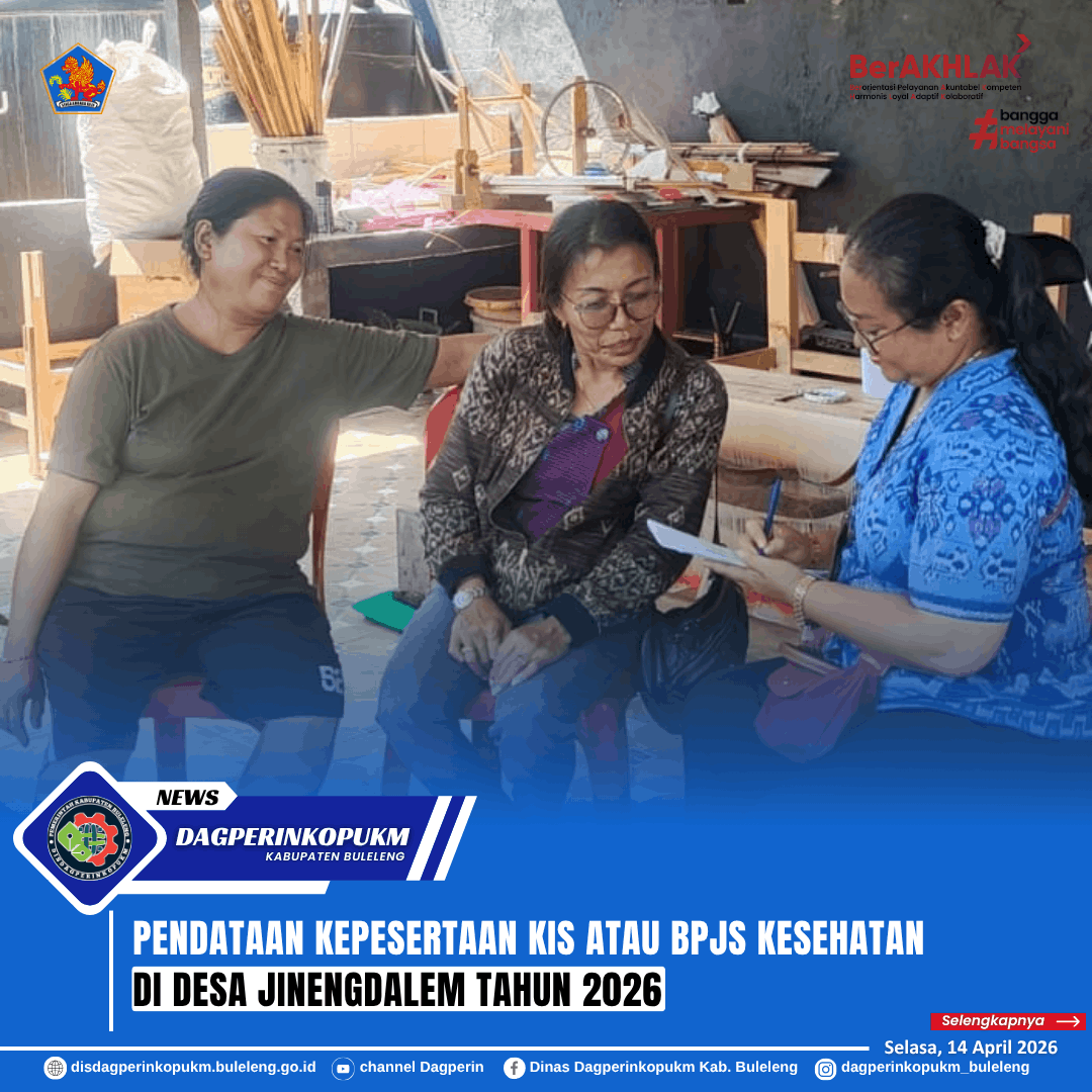 Pada Selasa, 14 April 2026, Bidang Industri yang diwakili oleh Luh Suasthini dan Desak Putu Budhi Utami Dewi, S.Pd melaksanakan pendataan kepesertaan KIS atau BPJS Kesehatan di Desa Jinengdalem.