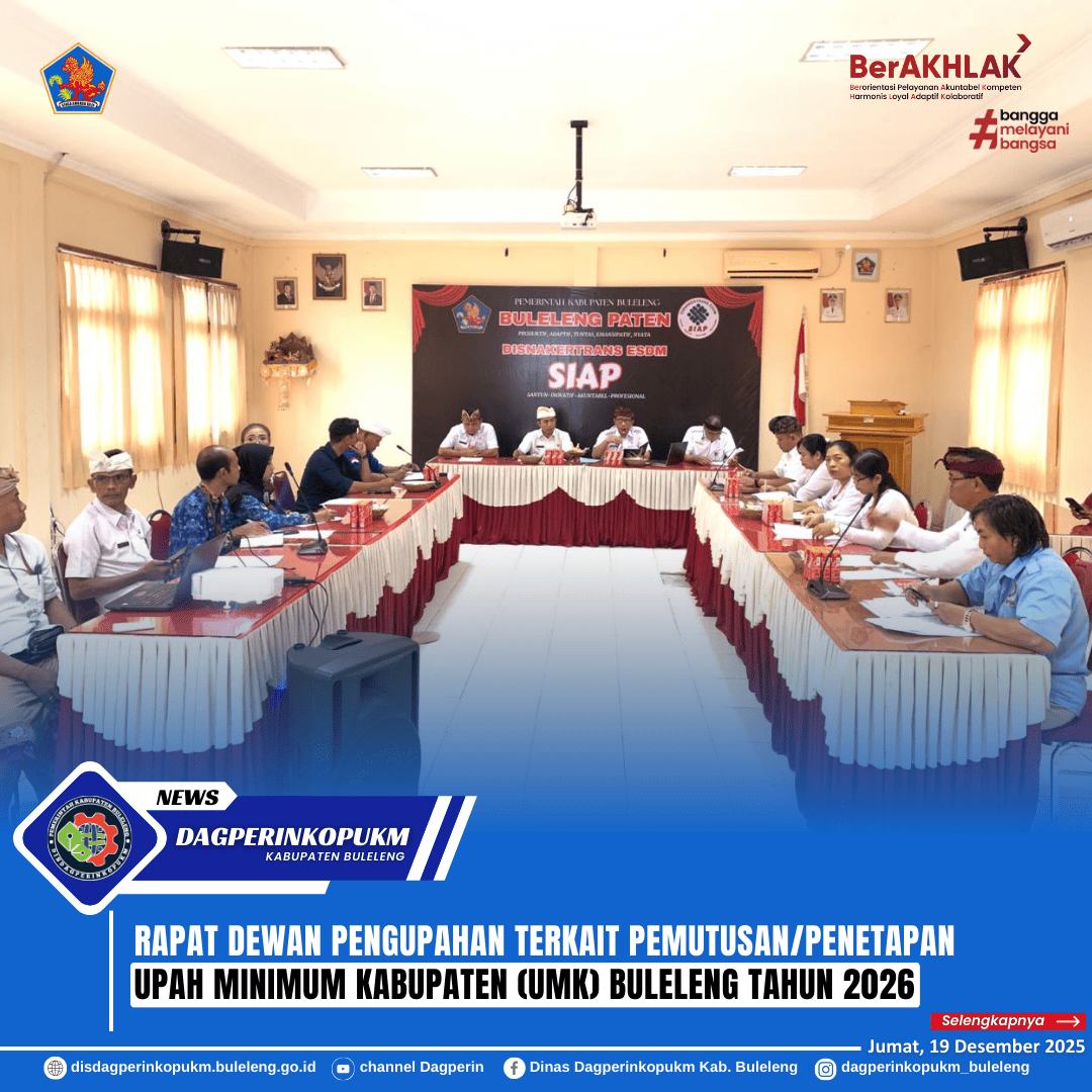 Sekretaris Dinas Dagperinkopukm Kabupaten Buleleng I Made Sudarmika menghadiri Rapat Dewan Pengupahan terkait Pemutusan/Penetapan Upah Minimum Kabupaten (UMK) Buleleng Tahun 2026. Rapat dilaksanakan di Aula Dinas Tenaga Kerja Buleleng pada, Jumat (19/12).