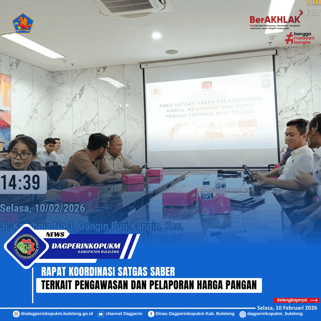 Selasa, 10 Februari 2026 - Kepala Bidang Pengembangan Perdagangan dan Pengawas Perdagangan Ahli Muda telah menghadiri undangan rapat koordinasi Satgas Saber. Kegiatan ini bertujuan untuk menyamakan persepsi antara Satreskrim/Satgas Pangan Polres dengan Dinas Perdagangan Kab/Kota serta Kontributor SP2KP terkait teknis pengawasan dan pelaporan harga pangan.