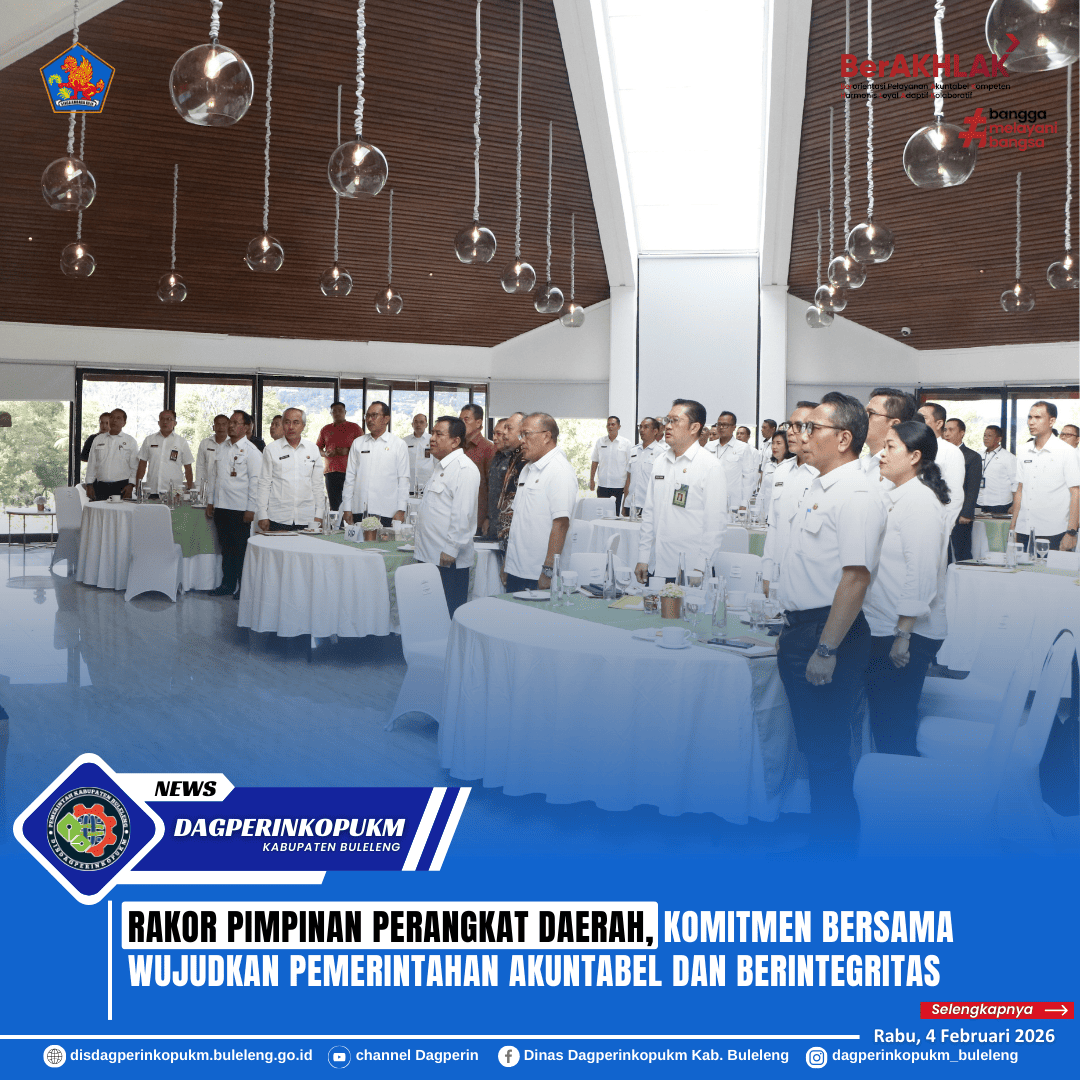 Kepala Dinas Dagperinkopukm Kabupaten Buleleng, Drs. Dewa Made Sudiarta, M.Si hadir pada kegiatan Rapat Koordinasi (Rakor) Pimpinan Perangkat Daerah yang berlangsung di Handara Golf and Resort. Rakor berlangsung selama 3 hari dimulai dari tanggal 3 Februari s/d 5 Februari 2026. Acara ini dibuka secara langsung oleh Wakil Bupati Buleleng, Gede Supriatna, S.H. Turut hadir Para Asisten dan Staf Ahli Sekretariat Daerah, seluruh Kepala Perangkat Daerah, Camat se-Kabupaten Buleleng, Kepala Bagian di lingkungan Setda Kab. Buleleng, serta hadir secara daring oleh perwakilan dari BPKP Bali serta Kementerian Pendayagunaan Aparatur Negara dan Reformasi Birokrasi (KemenPAN RB).