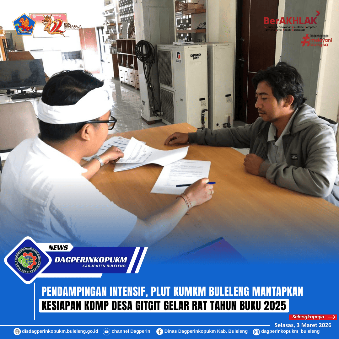 Tim PLUT KUMKM Kabupaten Buleleng melaksanakan pendampingan kepada Koperasi Desa Merah Putih (KDMP) Desa Gitgit pada, Selasa (3/3). Pendampingan difokuskan pada konsultasi persiapan pelaksanaan Rapat Anggota Tahunan (RAT) Tahun Buku 2025. Hal ini mengacu pada Surat Edaran Nomor 1 Tahun 2026 dari Kementerian Koperasi yang mewajibkan koperasi primer menyelenggarakan RAT paling lambat tiga bulan setelah tutup buku.