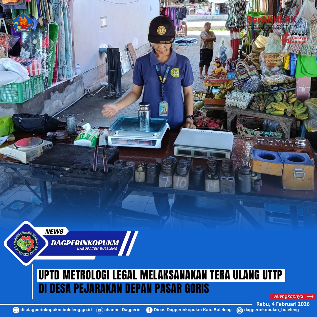 Rabu 4 Februari 2026 - UPTD Metrologi Legal Dinas Perdangan, Perindustrian, Koperasi, Usaha Kecil dan Menengah Kabupaten Buleleng melaksanakan tera ulang UTTP di pasar Goris Ds Pejarakan. Lokasi tera di areal depan pasar. Jumlah pedagang yang datang sebanyak 36 orang dengan rincian UTTP : 25 unit timbangan meja, 16 unit timbangan elektronik, 1 unit timbangan pegas, 3 unit timbangan sentisimal dan 145 anak timbangan. Semua UTTP telah diuji dan disahkan tahun 2026.