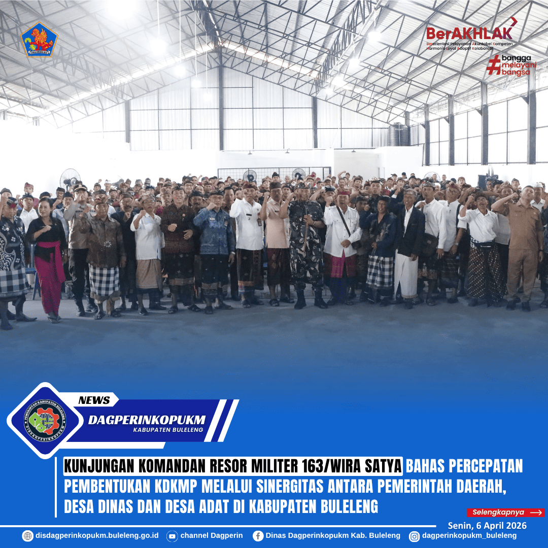 Kepala Dinas Dagperinkopukm Kabupaten Buleleng, Drs. Dewa Made Sudiarta, M.Si. bersama Kepala Bidang Koperasi, Luh Putu Melly Wahyuni menghadiri Kegiatan Sosialisasi KDKMP sekaligus peninjauan lapangan rencana pembangunan jembatan perintis Garuda di wilayah Buleleng oleh Danrem 163/Wira Satya Brigjen TNI Ida I Dewa Agung Hadisaputra, S.H. Acara berlangsung di Kantor Desa Giri Emas, Kecamatan Sawan, Senin (6/4).