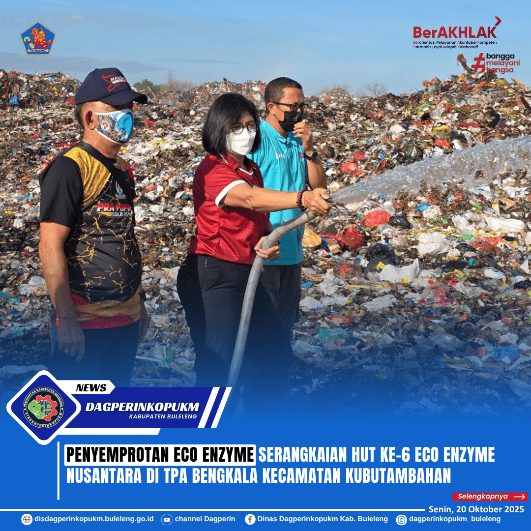 Sekretaris Dinas Dagperinkopukm Kabupaten Buleleng I Made Sudarmika menghadiri serta ikut serta pada kegiatan penyemprotan eco enzyme serangkaian HUT ke-6 Eco Enzyme Nusantara yang dilaksanakan di TPA Bengkala, Kec. Kubutambahan, pada Senin (20/10).