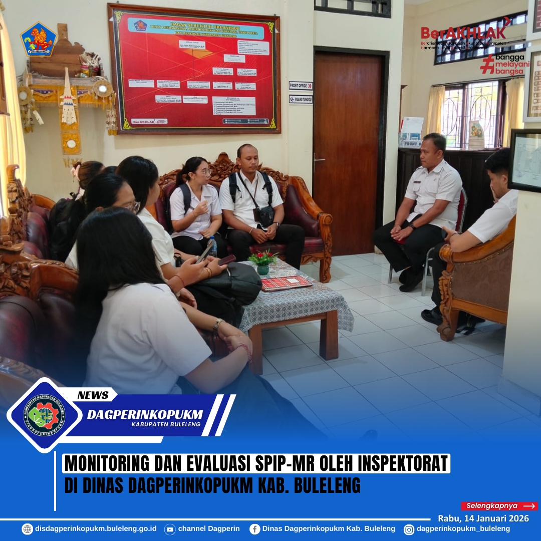 Buleleng, 14 Januari 2026 - Sekretaris Dinas Perdagangan Perindustrian Koperasi Usaha Kecil dan Menengah Kabupaten Buleleng Bapak I Made Sudarmika menerima kunjungan dinas dari Inspektorat Buleleng di Dinas Dagperinkopukm pada hari Rabu (14/1) .