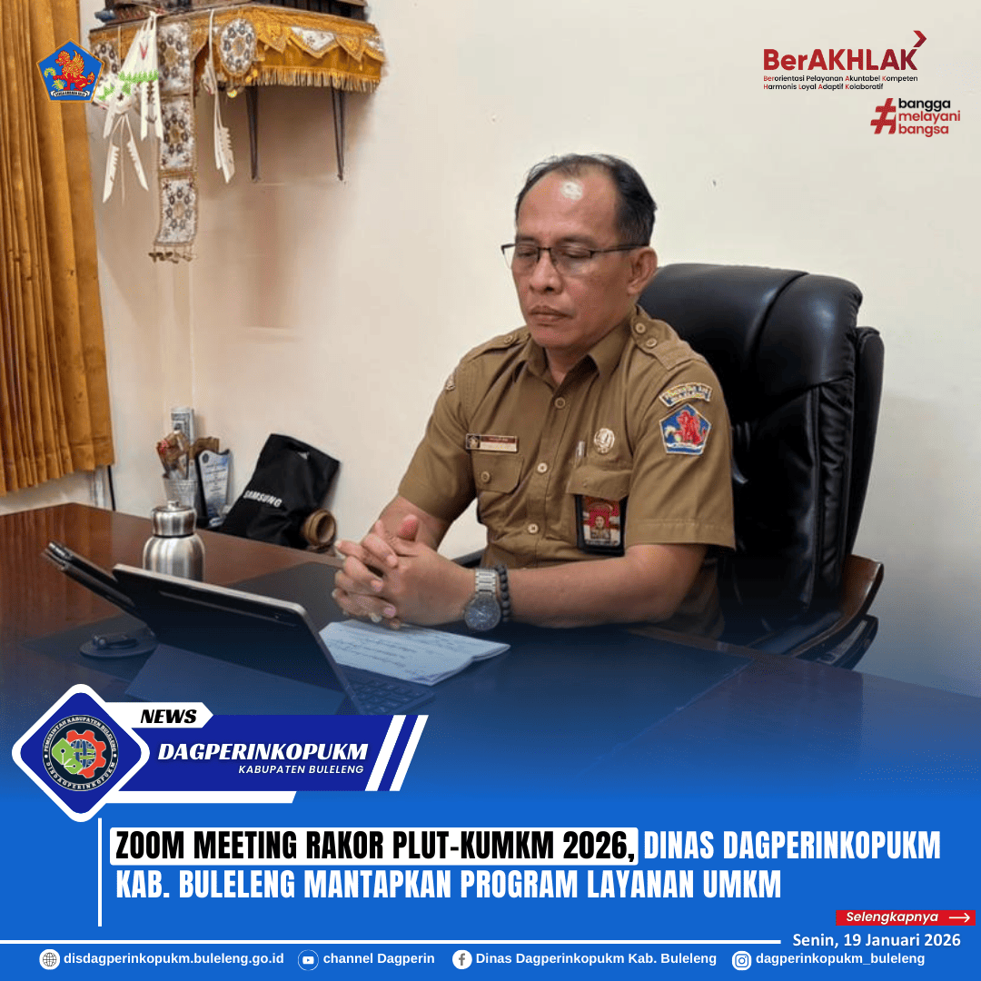 Buleleng, 19 Januari 2026 - Dinas Perdagangan, Perindustrian, Koperasi, Usaha Kecil dan Menengah (Dagperinkopukm) Kabupaten Buleleng mengikuti Zoom Meeting Rapat Koordinasi PLUT-KUMKM Tahun 2026. Kegiatan ini diikuti oleh Kepala Dinas Dagperinkopukm Kabupaten Buleleng Dewa Made Sudiarta, jajaran Bidang Pemberdayaan Usaha Mikro, serta UPTD PLUT KUMKM Kabupaten Buleleng.