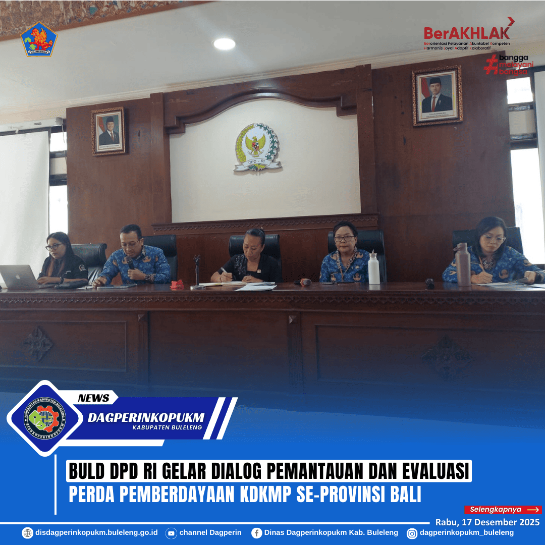 Badan Urusan Legislasi Daerah (BULD) DPD RI menyelenggarakan Dialog bertema “Pemantauan dan Evaluasi terhadap berbagai kebijakan perda dan perkada Terkait Pemberdayaan Koperasi di Daerah (Koperasi Desa dan Kelurahan Merah Putih)” yang difasilitasi oleh Anggota DPD RI Perwakilan Bali, Ni Luh Djelantik. Kegiatan ini dihadiri oleh perangkat daerah yang membidangi koperasi dan UKM, pemberdayaan masyarakat dan desa, Bappeda kabupaten/kota se-Provinsi Bali, serta Gugus Tugas Percepatan KDKMP provinsi dan kabupaten/kota.